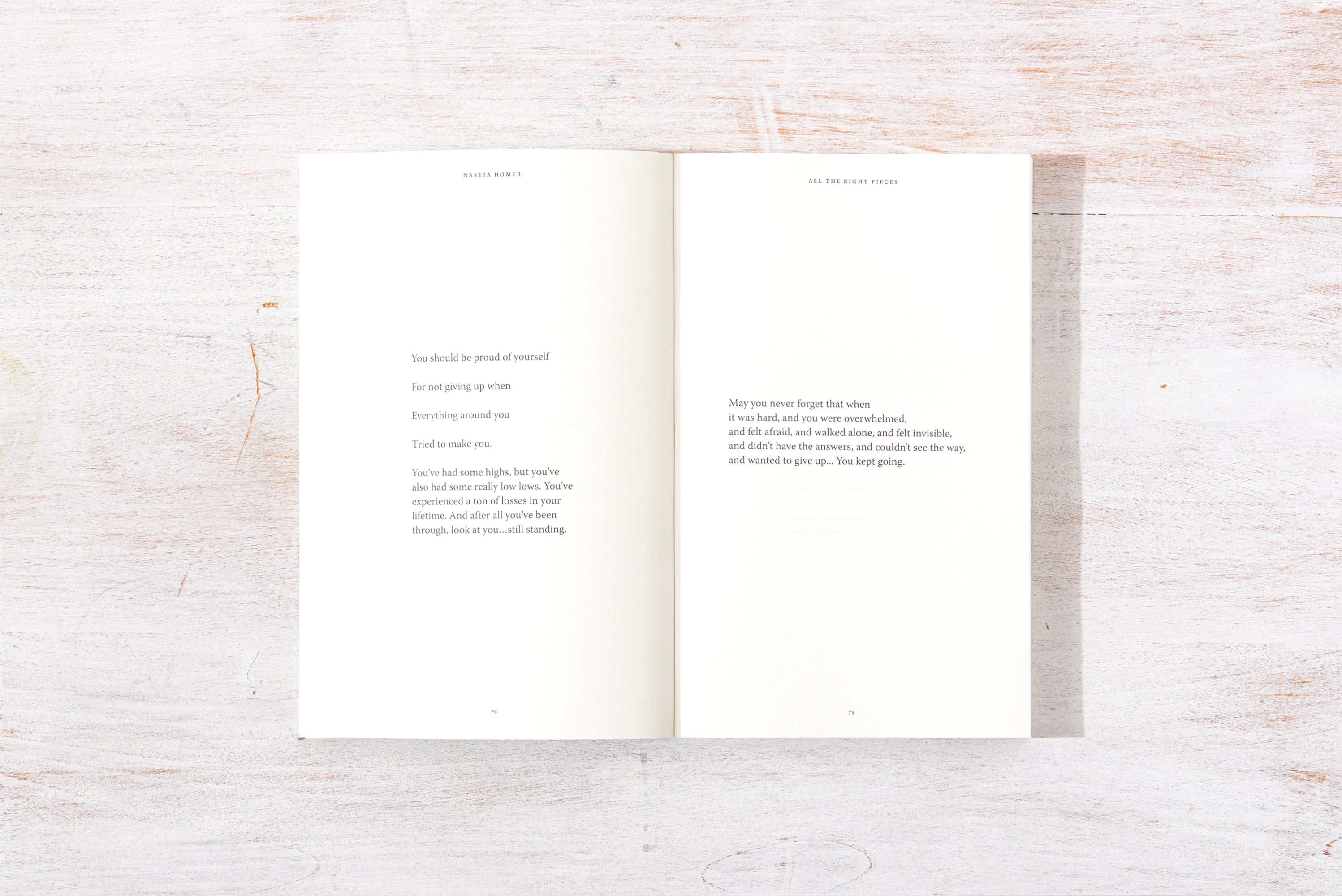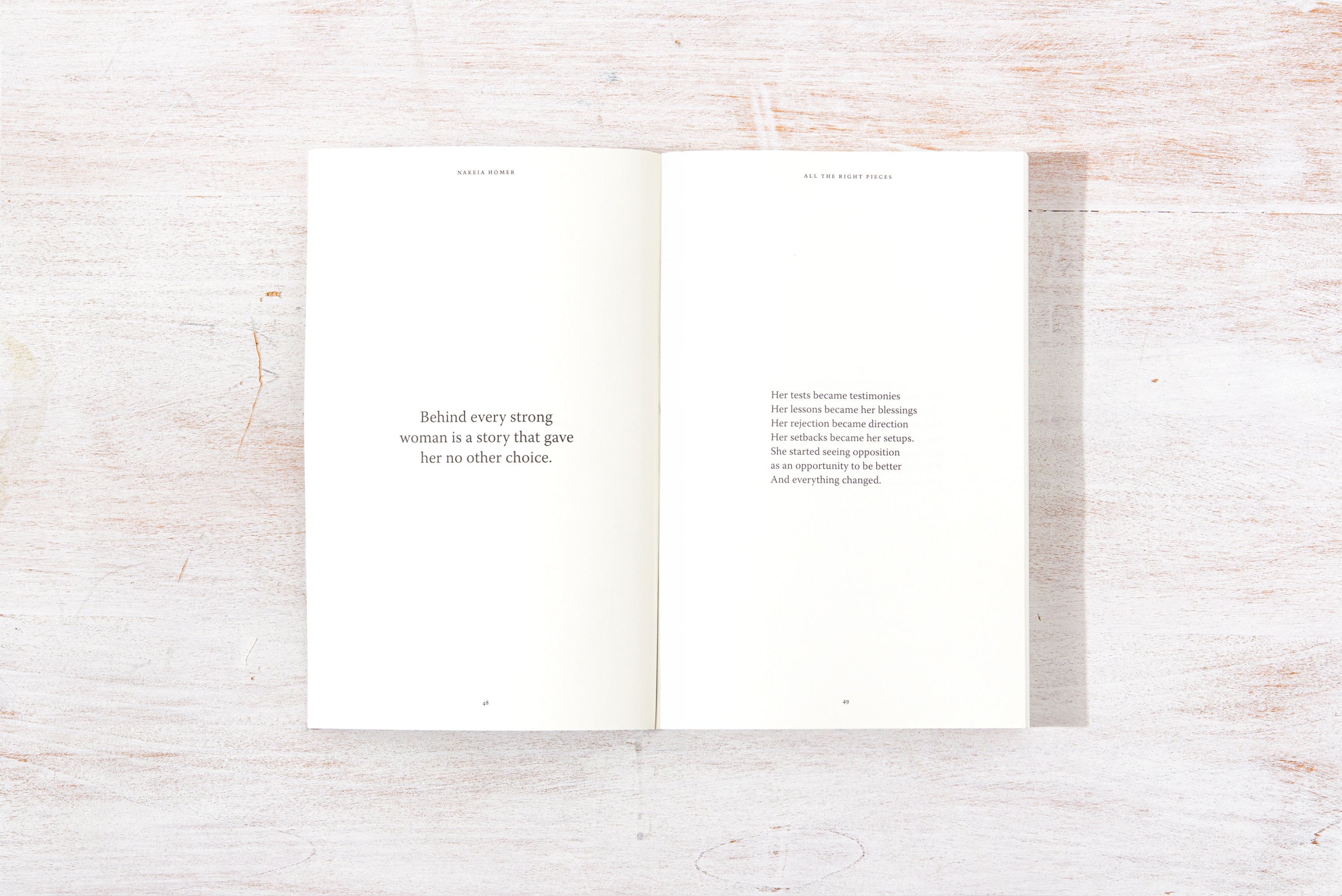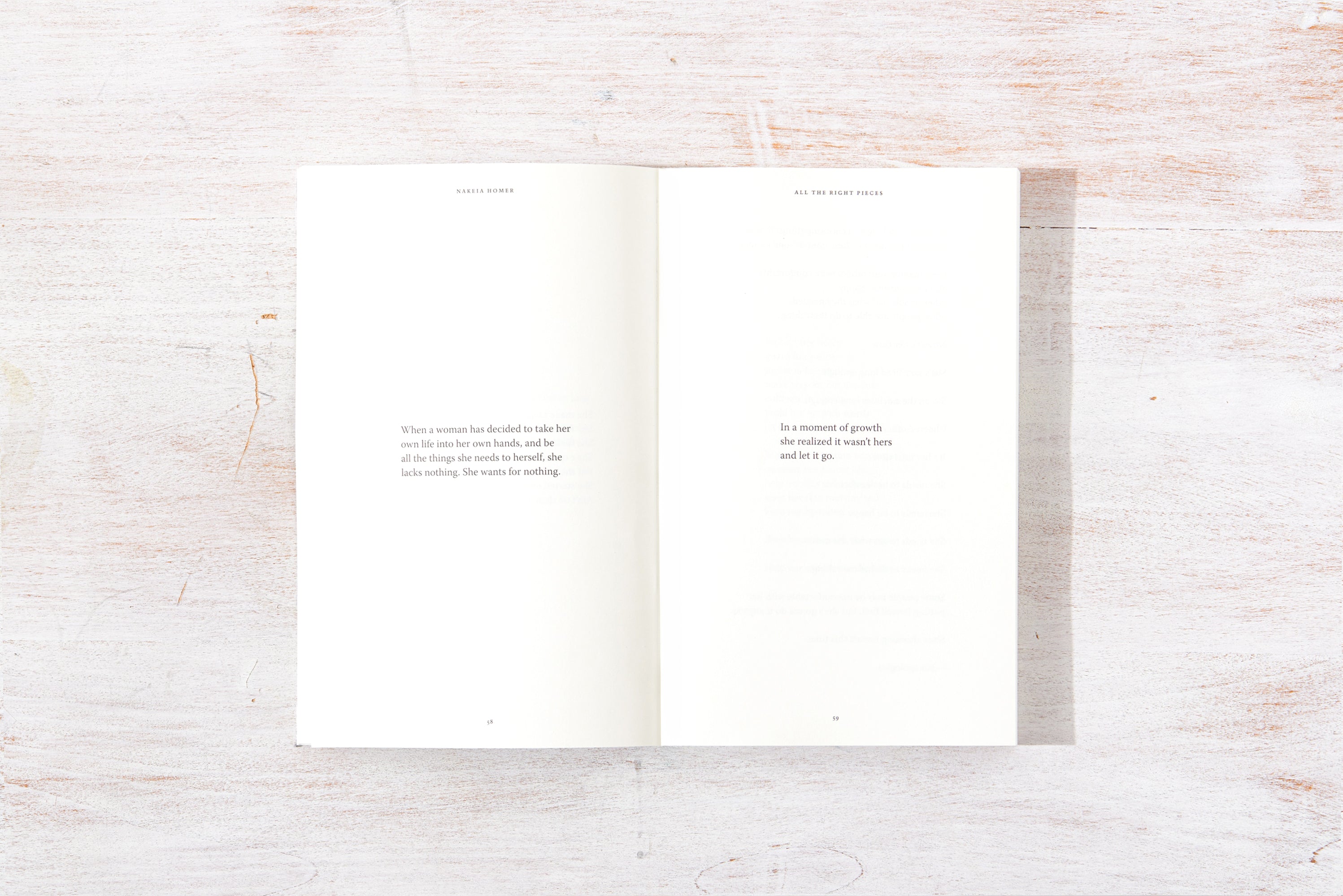 This collection of short prose, poetry, and soul-stirring reminders, from Nakeia Homer, is a commemoration of all of life, the good and the bad, coming together for our highest good. All The Right Pieces lays out the process of becoming in a way that helps us see that every version of us, every season we go through, and every circumstance we face contributes to making us whole.