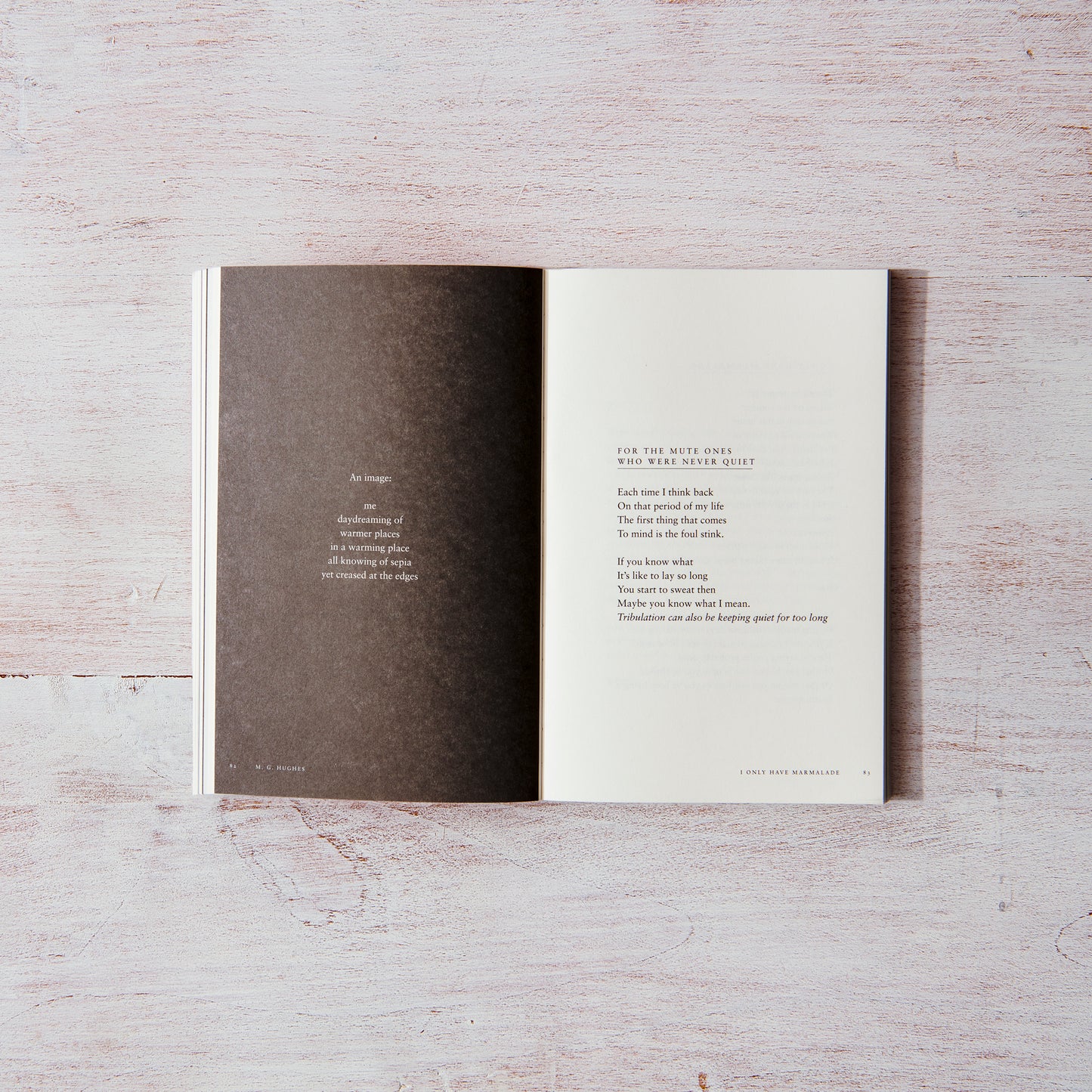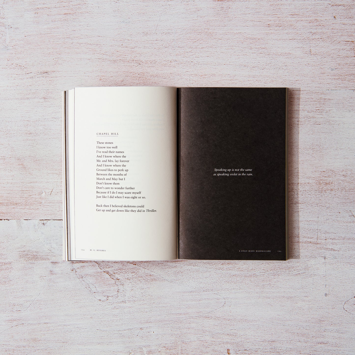 Echoing themes of healing, identity, race, feminism, and the environment I Only Have Marmalade is a poetry collection that seeks to answer the question: “What’s going on?” By reflecting on what it means to grow up both Black and the daughter of an immigrant, exploring complicated memories of her mental health journey, and assembling bittersweet paintings of the social and environmental climate she exists within, M. G. Hughes’ words offer a balm to anyone who has ever felt completely lost, unsure, or unwanted.