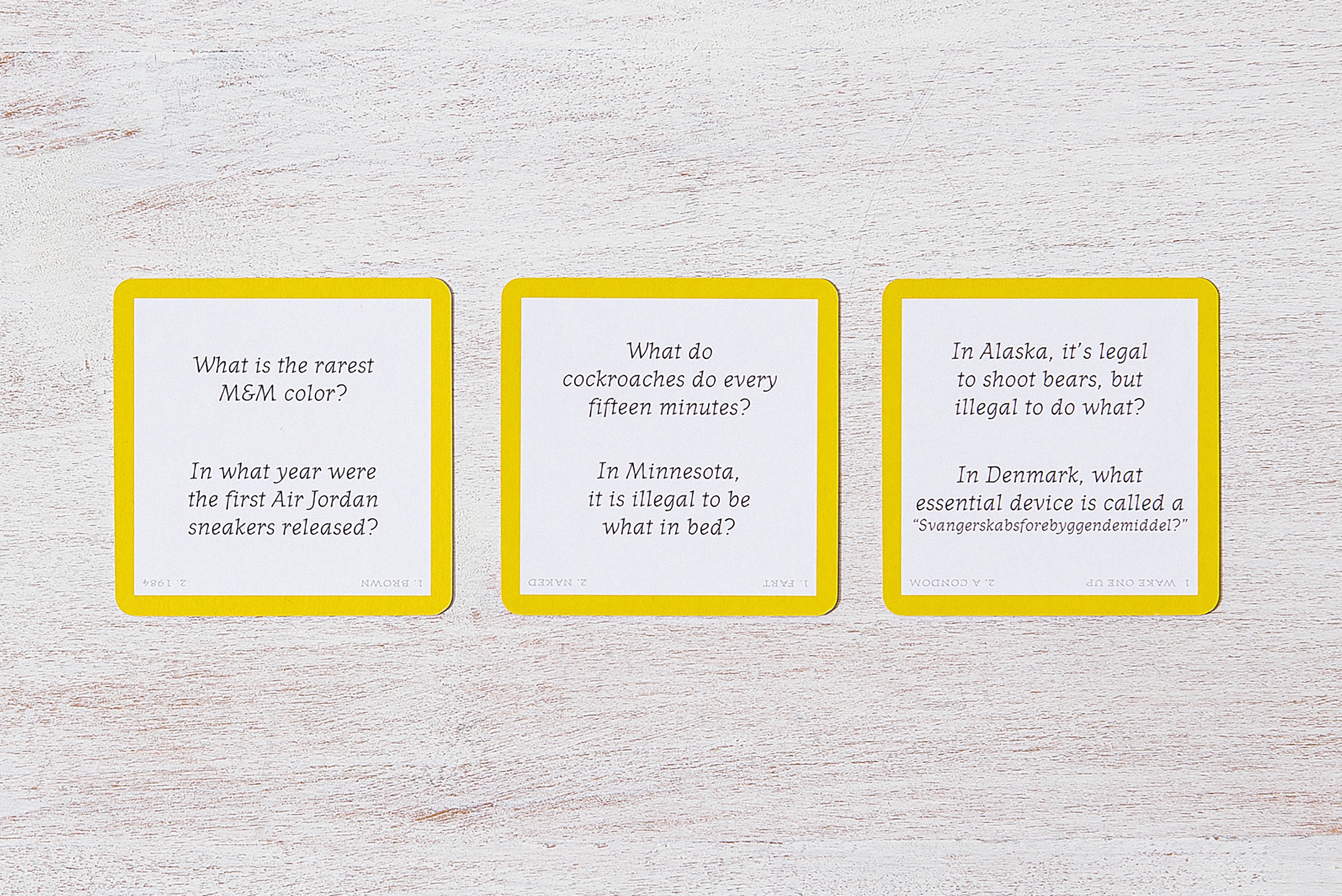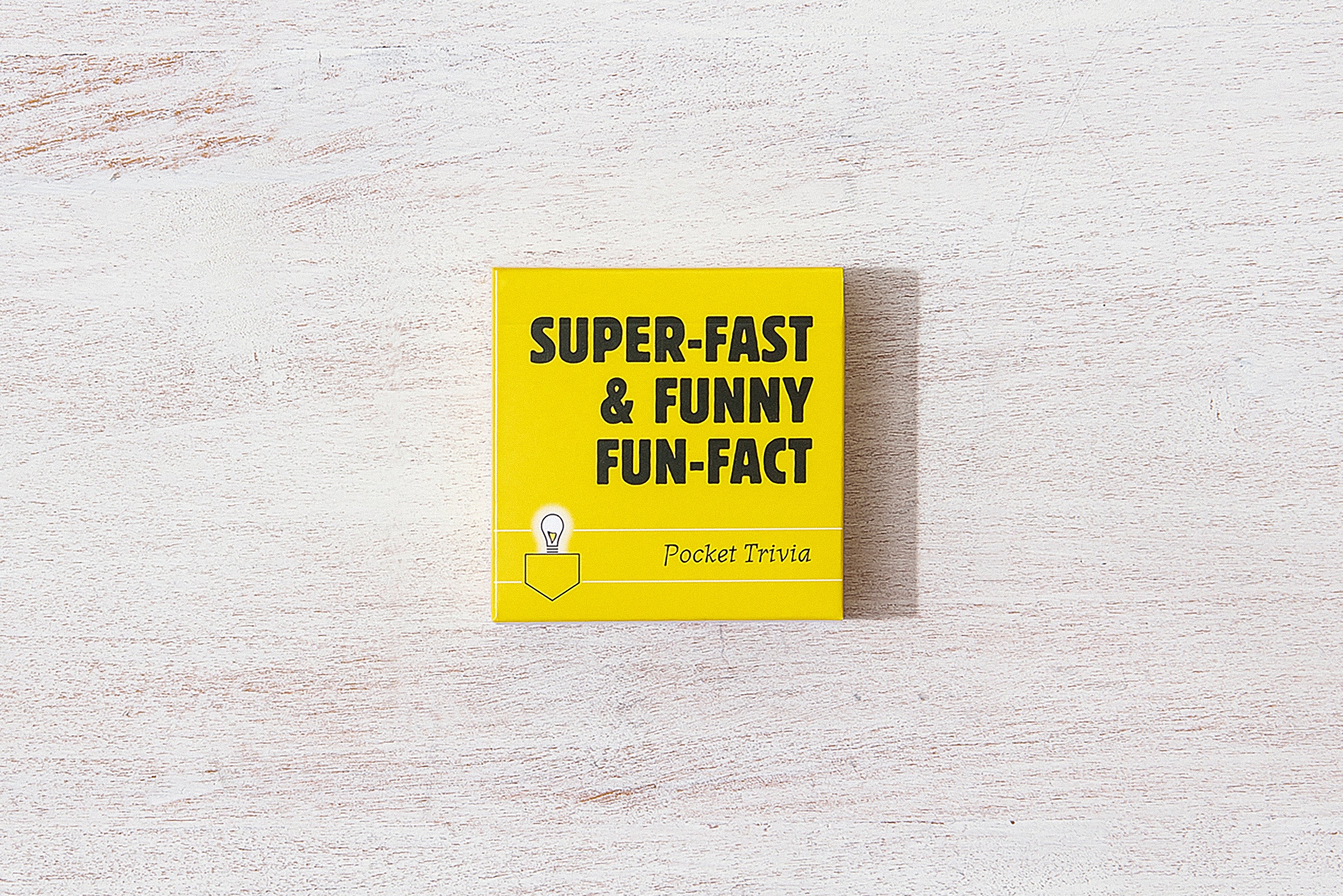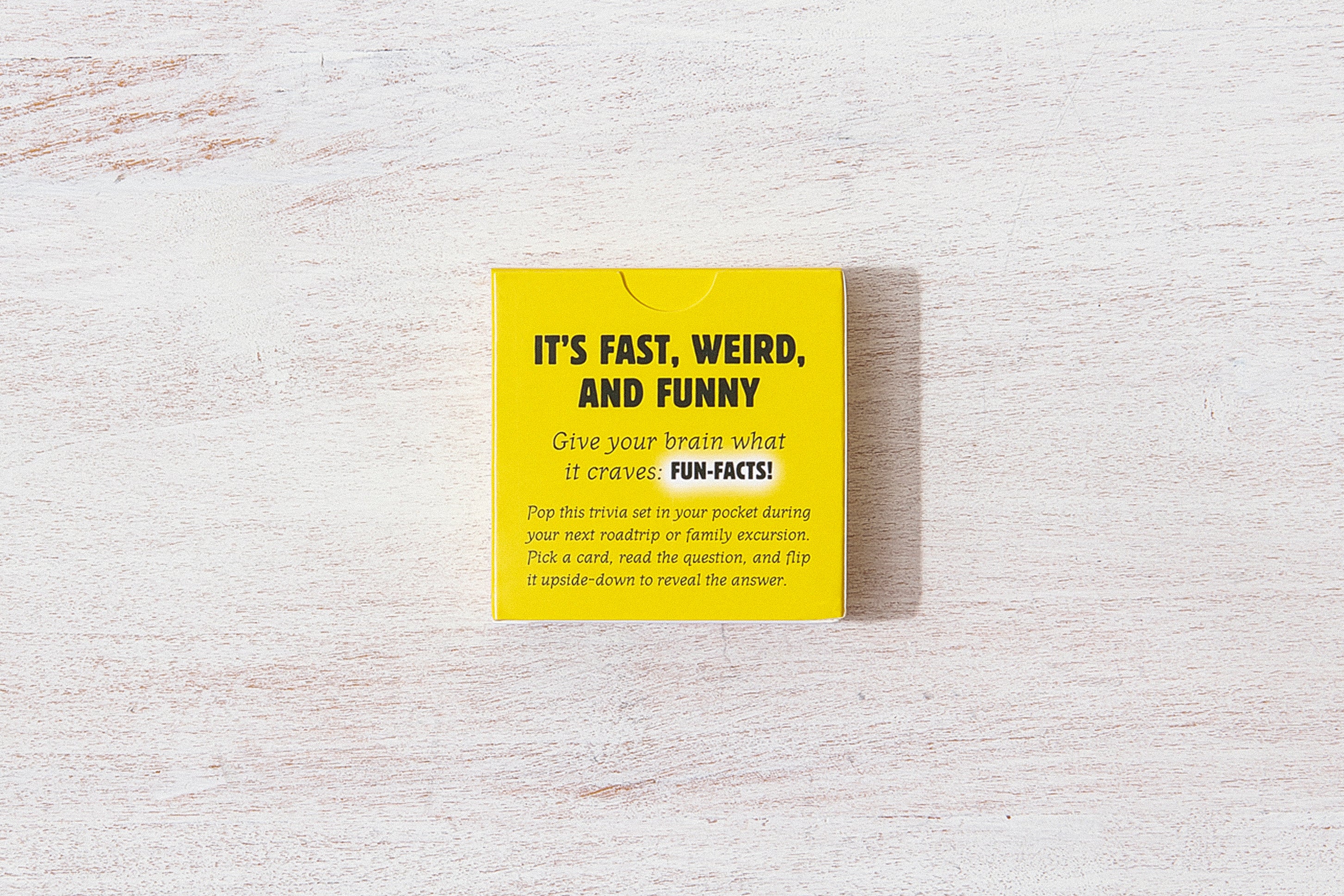 Give your brain what it craves—FUN-Facts—with this pocket-sized trivia deck. Perfect for road trips, campouts, game nights, or entertaining strangers while in line for coffee, simply pick a card, read the question, and flip it upside-down to reveal the answer. Impress your friends, family, and co-workers with this simple and entertaining game and sharpen your fun-fact knowledge in the process.
