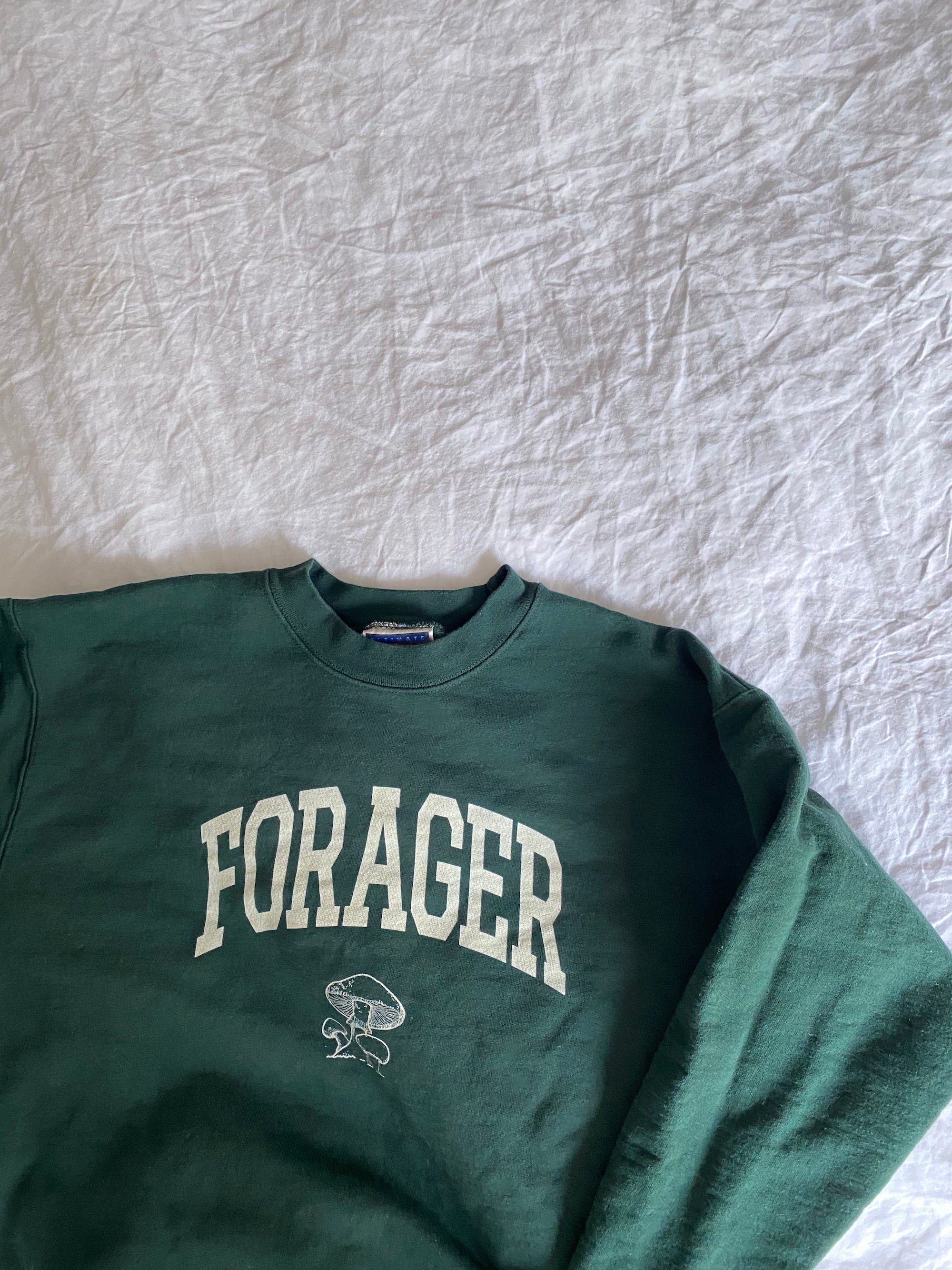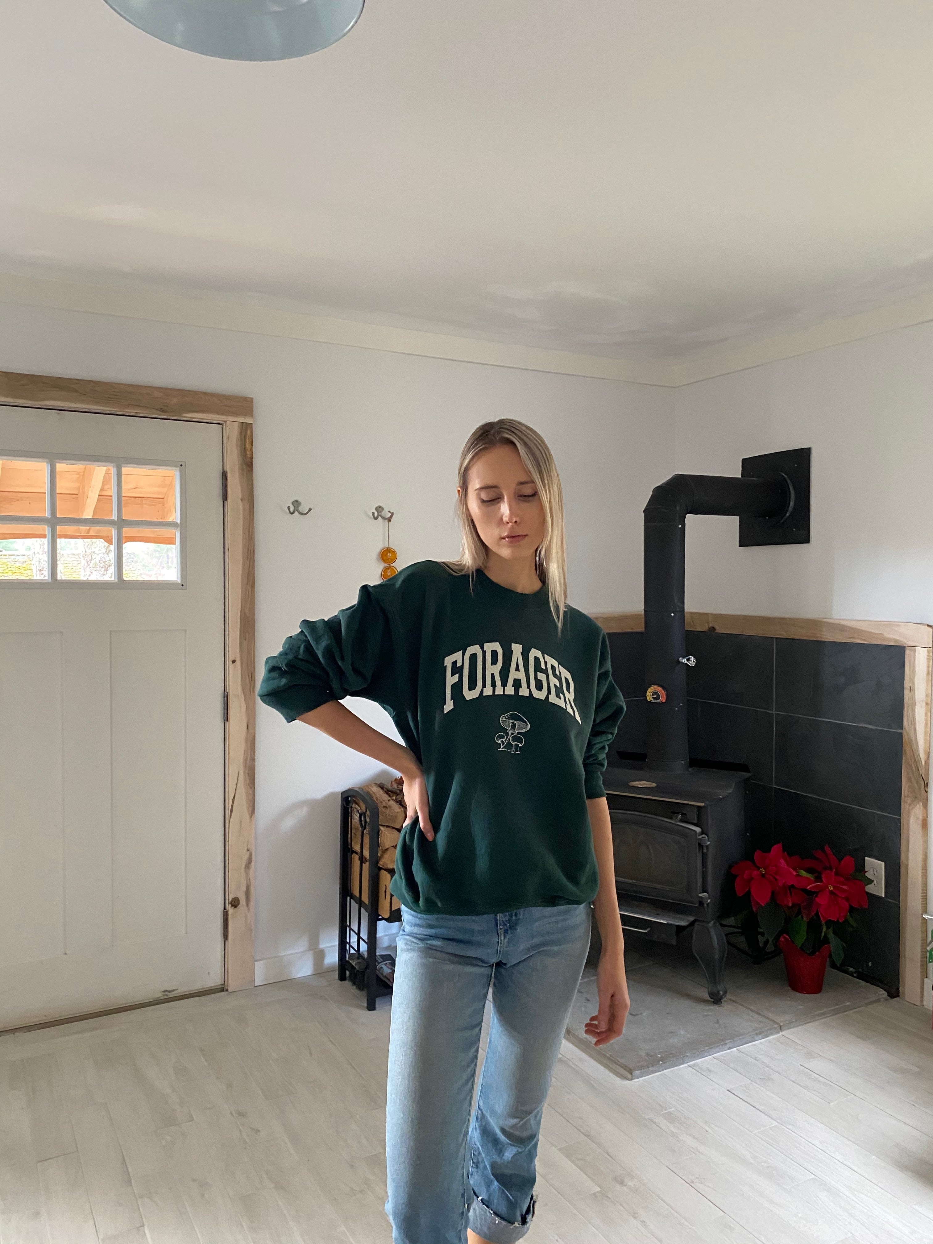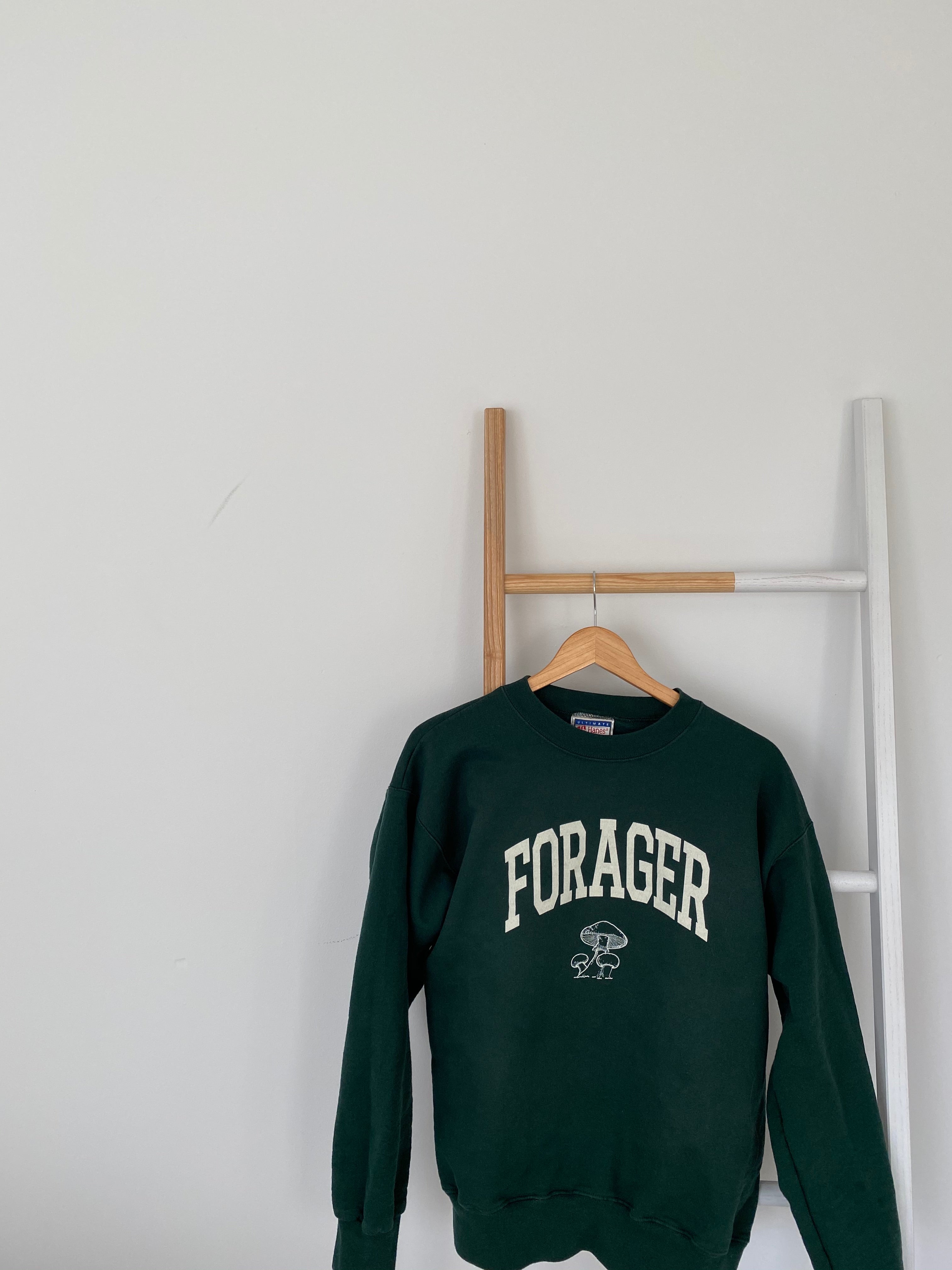 Deep forest green meets a soft (but heavy) vintage wash sweatshirt. The word “Forager” is branded across the sweatshirt with a custom illustration of a mushroom below it. Express your fascination and passion for the natural world and its wonders with this sweatshirt.