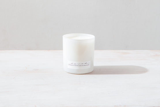 Scented soy candle in 11oz white glass tumbler. 3.5 x 3.25 inches. Will burn for approximately 90 hours.