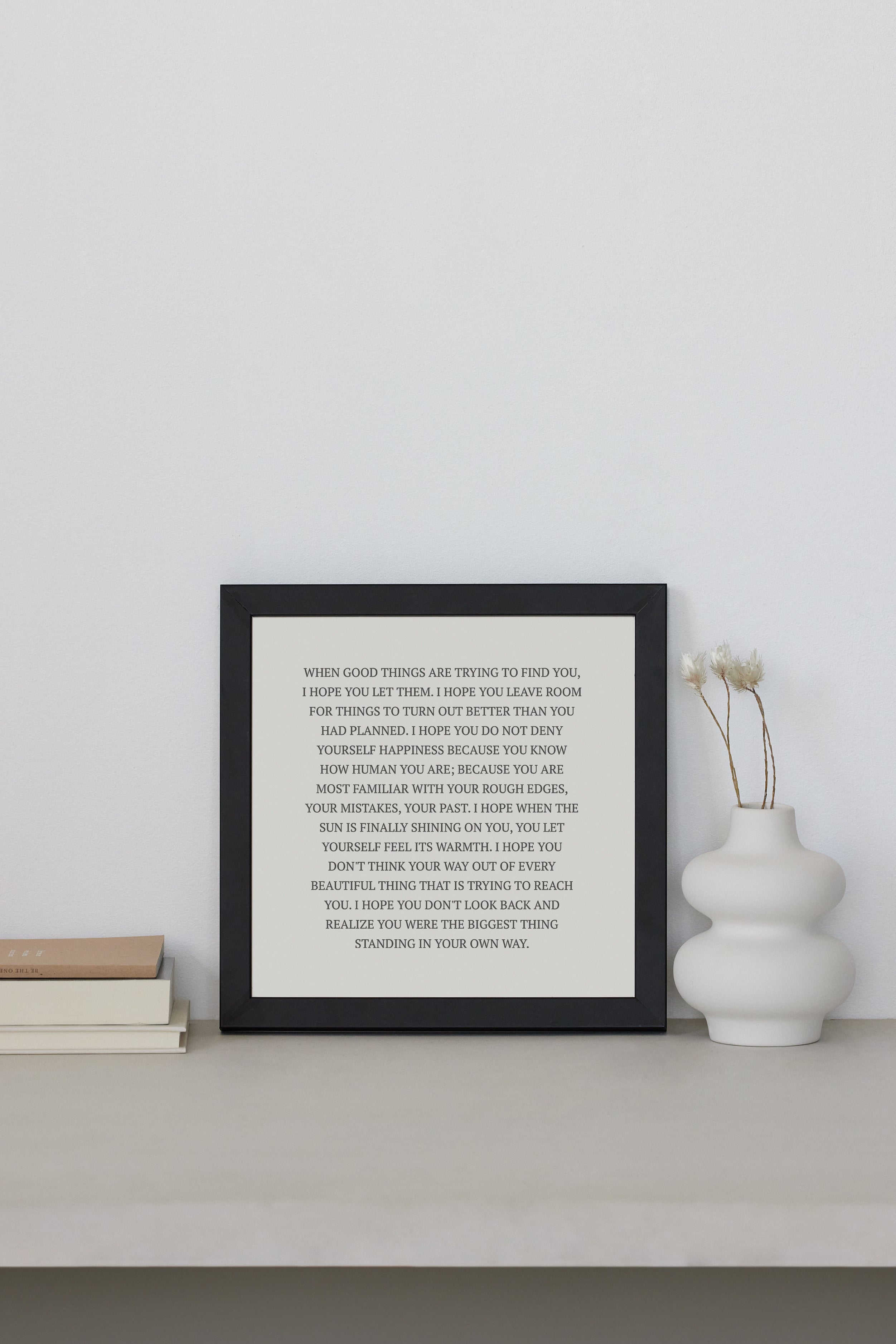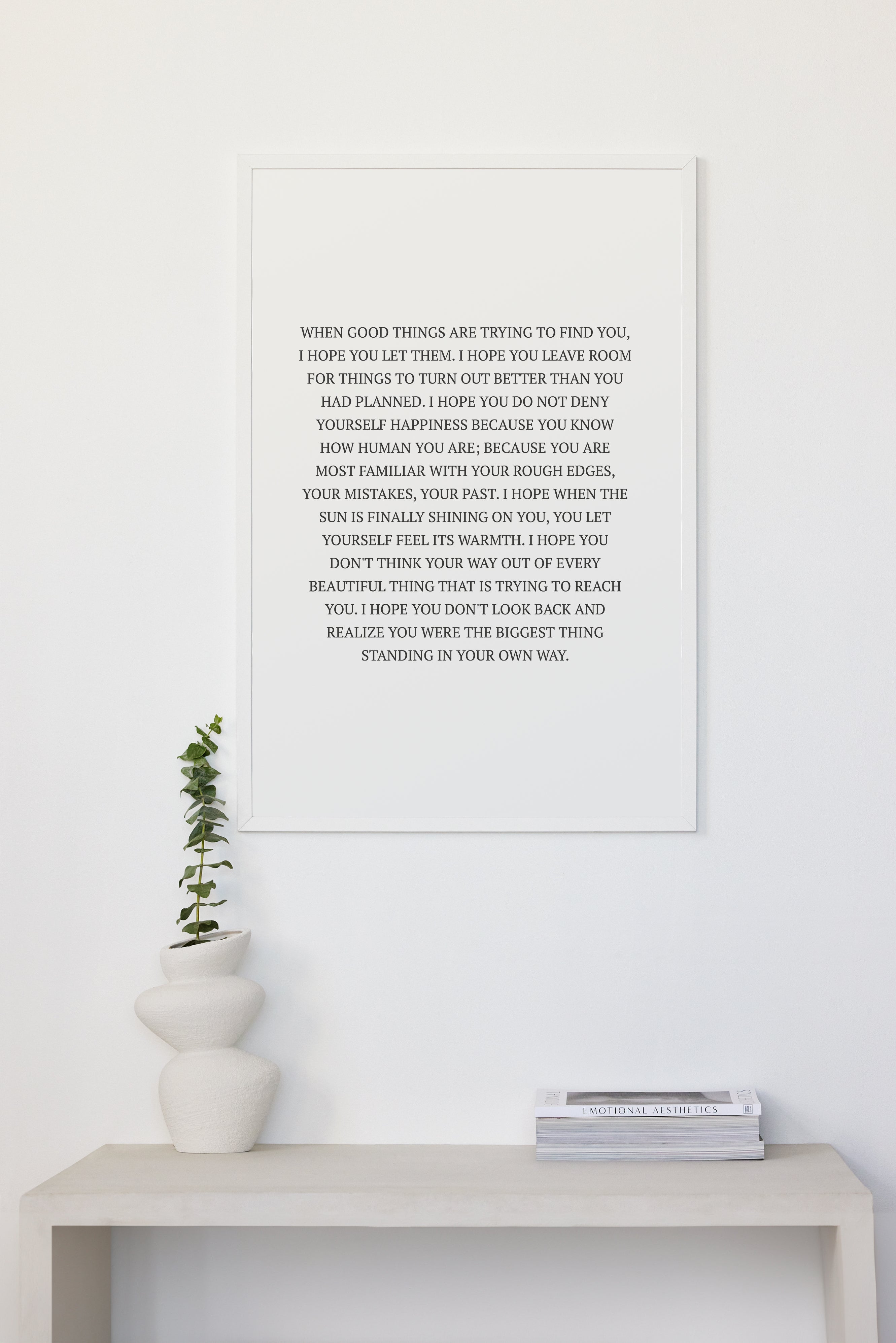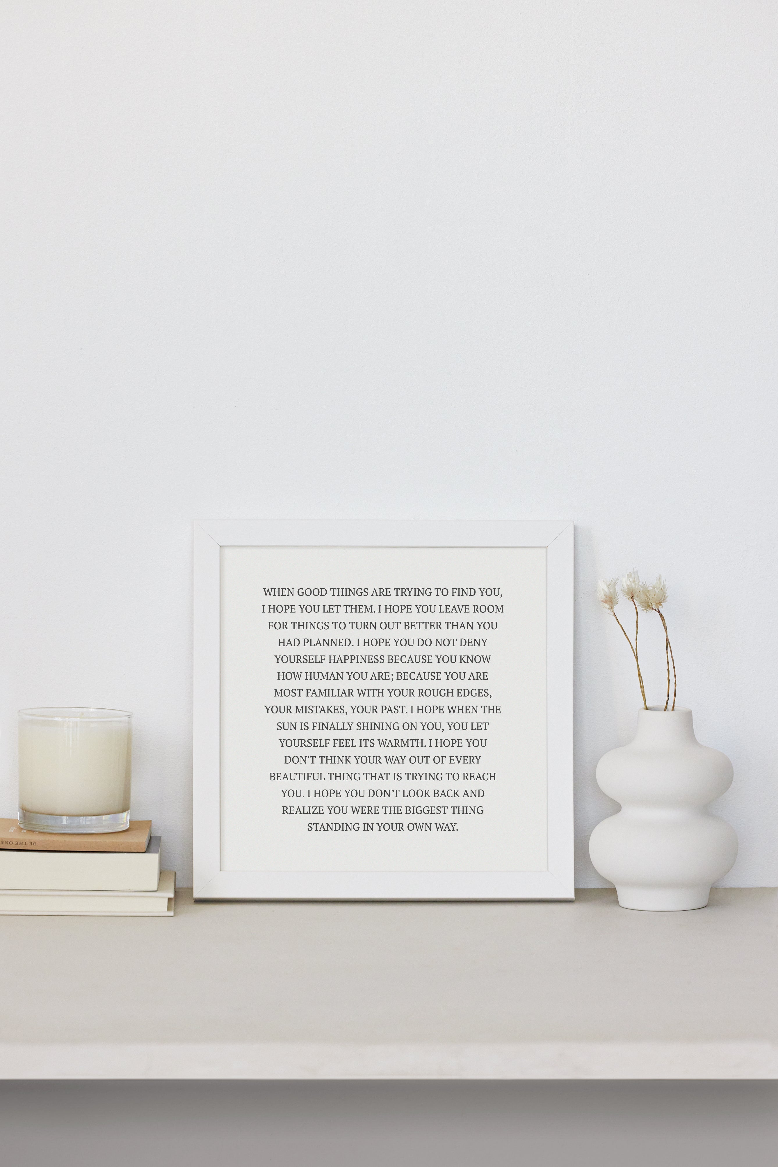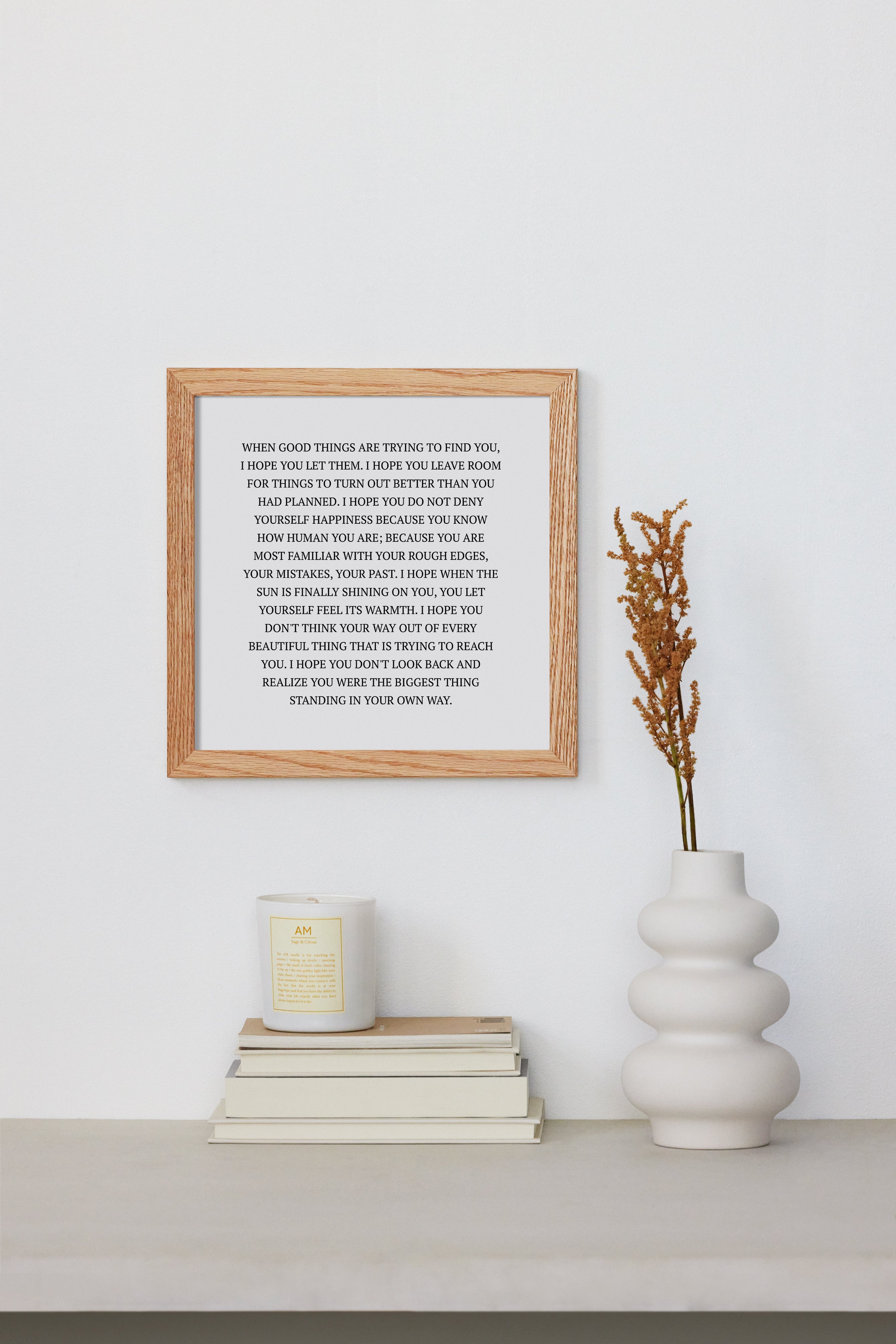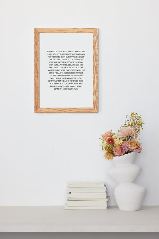 WHEN GOOD THINGS ARE TRYING TO FIND YOU, I HOPE YOU LET THEM. I HOPE YOU LEAVE ROOM FOR THINGS TO TURN OUT BETTER THAN YOU HAD PLANNED. I HOPE YOU DO NOT DENY YOURSELF HAPPINESS BECAUSE YOU KNOW HOW HUMAN YOU ARE; BECAUSE YOU ARE MOST FAMILIAR WITH YOUR ROUGH EDGES, YOUR MISTAKES, YOUR PAST. I HOPE WHEN THE SUN IS FINALLY SHINING ON YOU, YOU LET YOURSELF FEEL ITS WARMTH. I HOPE YOU DON'T THINK YOUR WAY OUT OF EVERY BEAUTIFUL THING THAT IS TRYING TO REACH YOU. I HOPE YOU DON'T LOOK BACK AND REALIZE YOU WERE THE BIGGEST THING STANDING IN YOUR OWN WAY.