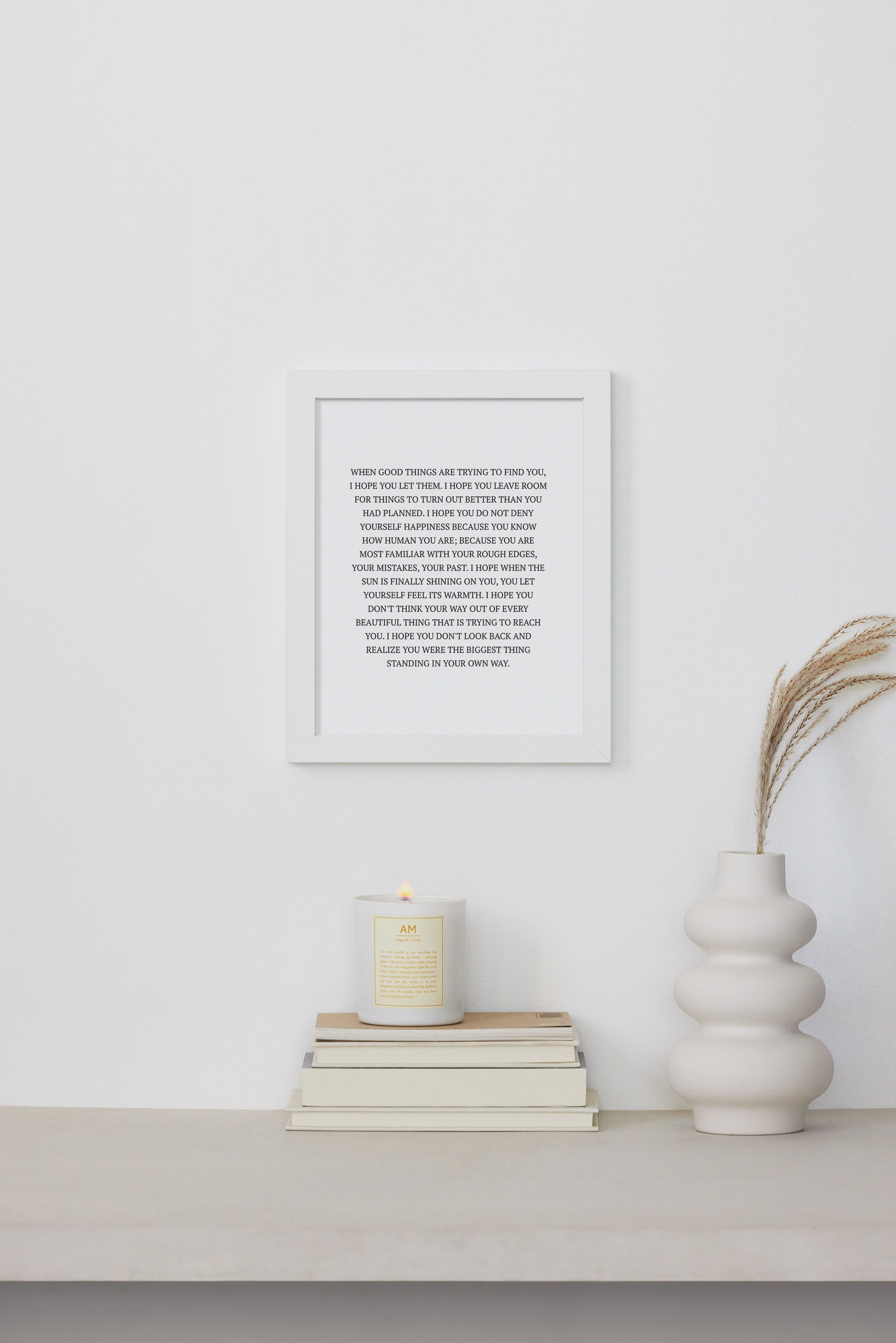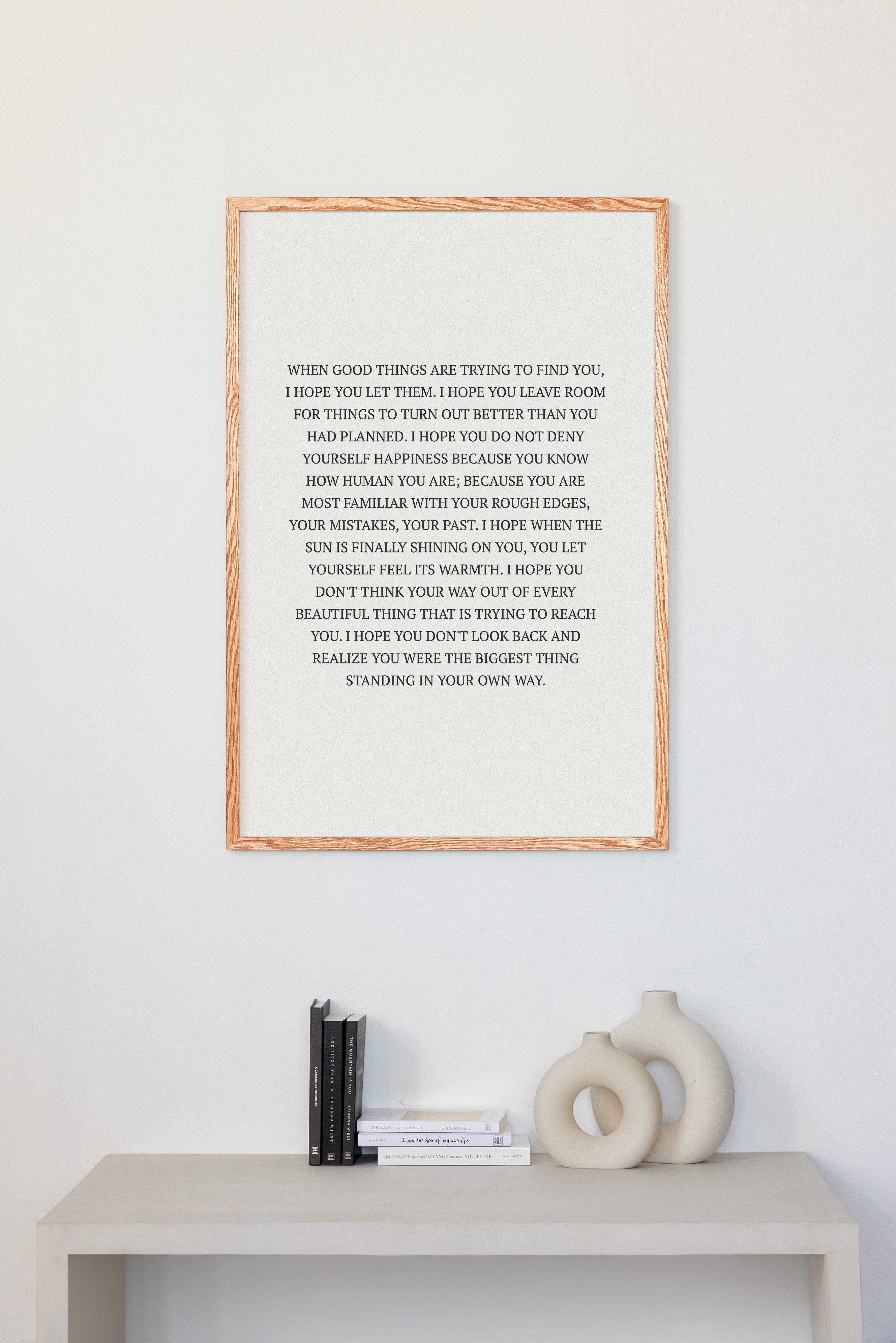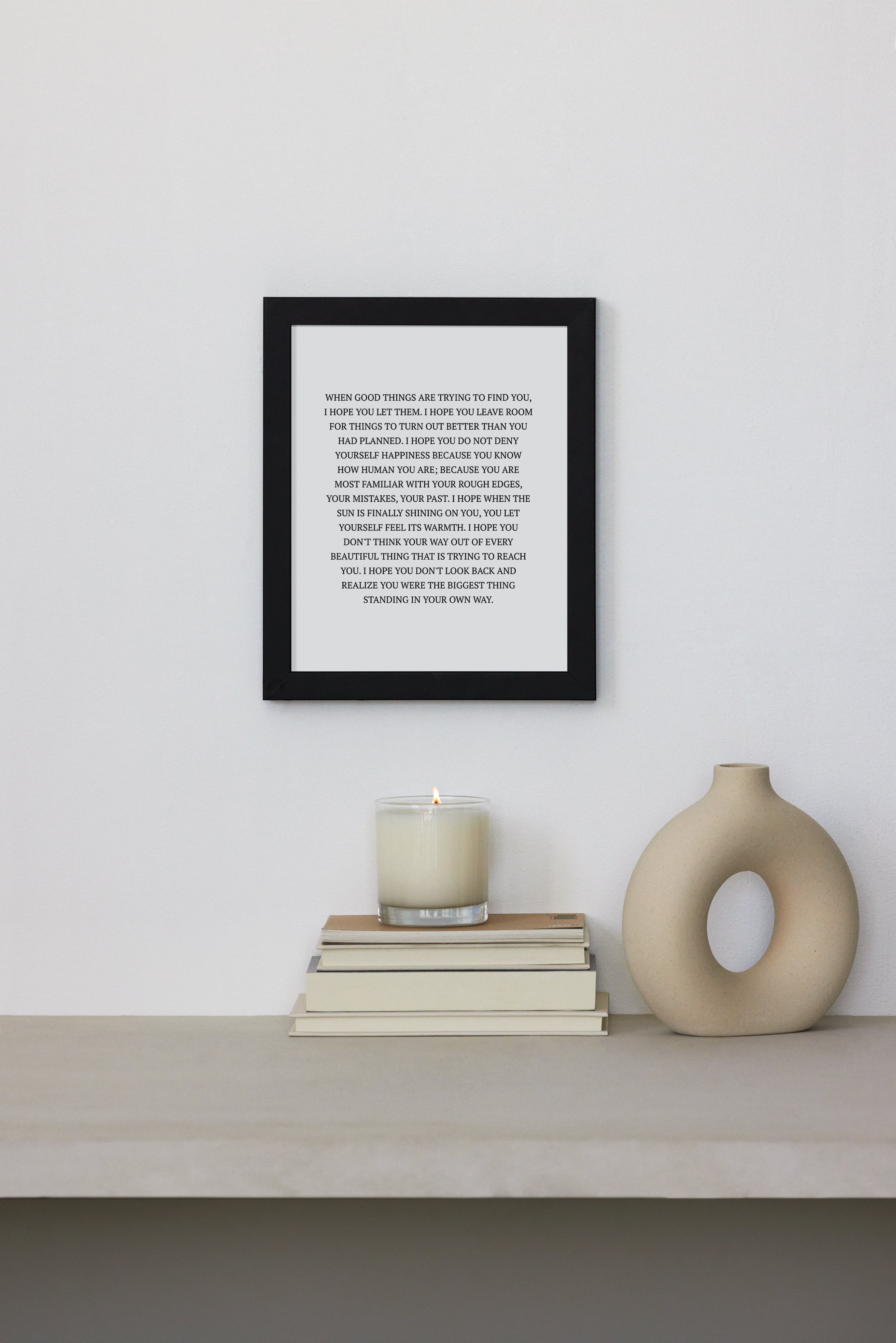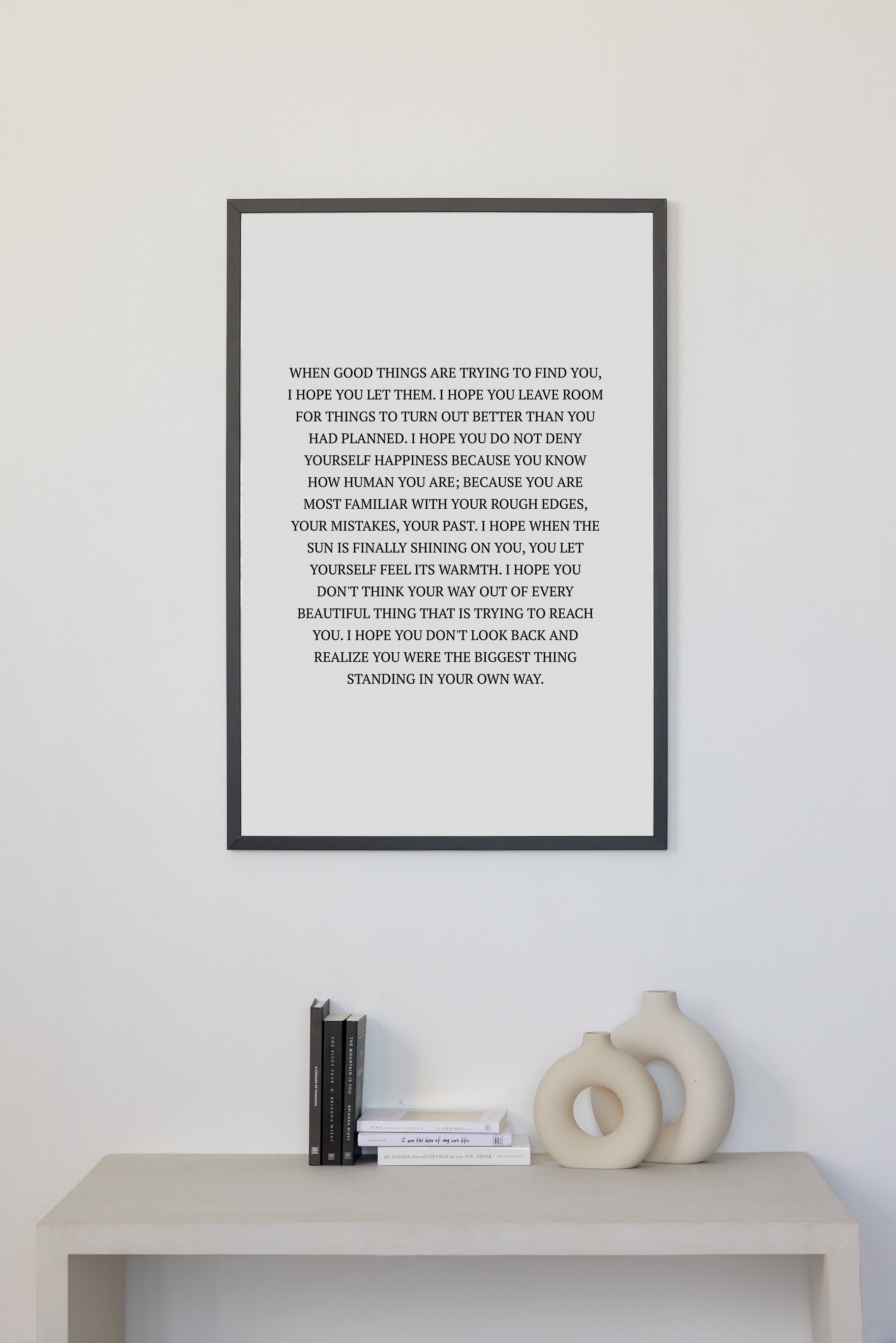 WHEN GOOD THINGS ARE TRYING TO FIND YOU, I HOPE YOU LET THEM. I HOPE YOU LEAVE ROOM FOR THINGS TO TURN OUT BETTER THAN YOU HAD PLANNED. I HOPE YOU DO NOT DENY YOURSELF HAPPINESS BECAUSE YOU KNOW HOW HUMAN YOU ARE; BECAUSE YOU ARE MOST FAMILIAR WITH YOUR ROUGH EDGES, YOUR MISTAKES, YOUR PAST. I HOPE WHEN THE SUN IS FINALLY SHINING ON YOU, YOU LET YOURSELF FEEL ITS WARMTH. I HOPE YOU DON'T THINK YOUR WAY OUT OF EVERY BEAUTIFUL THING THAT IS TRYING TO REACH YOU. I HOPE YOU DON'T LOOK BACK AND REALIZE YOU WERE THE BIGGEST THING STANDING IN YOUR OWN WAY.