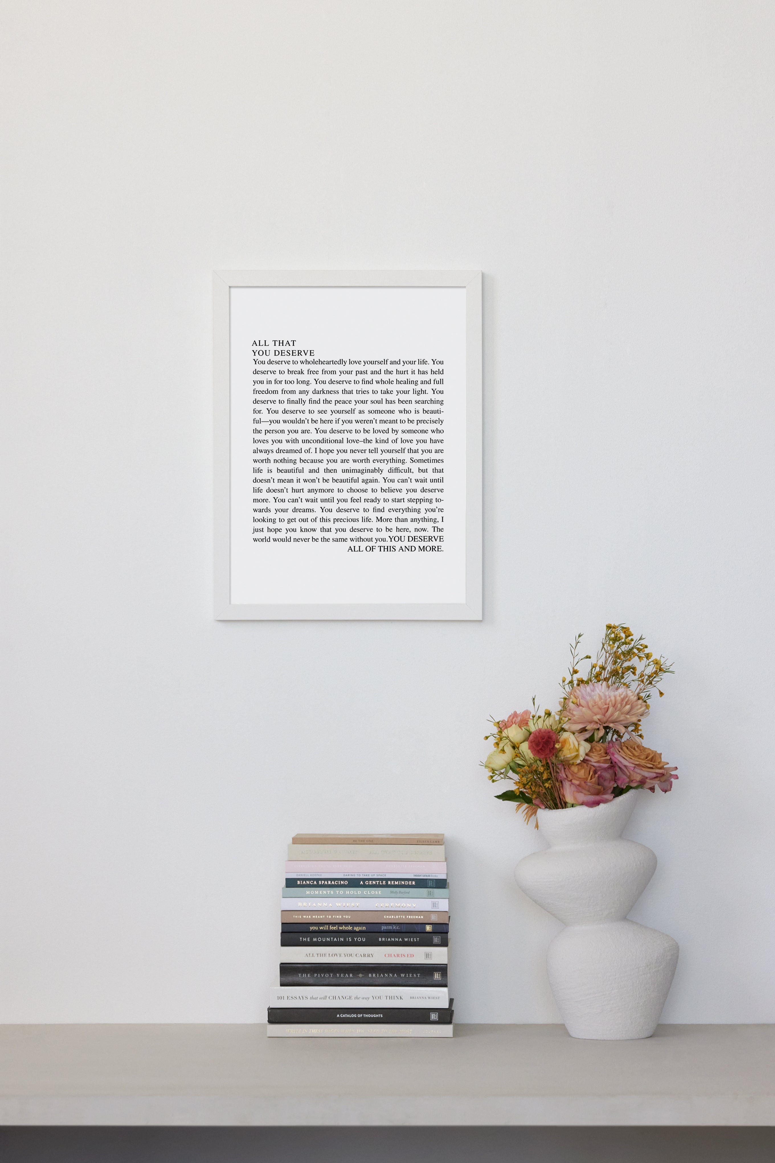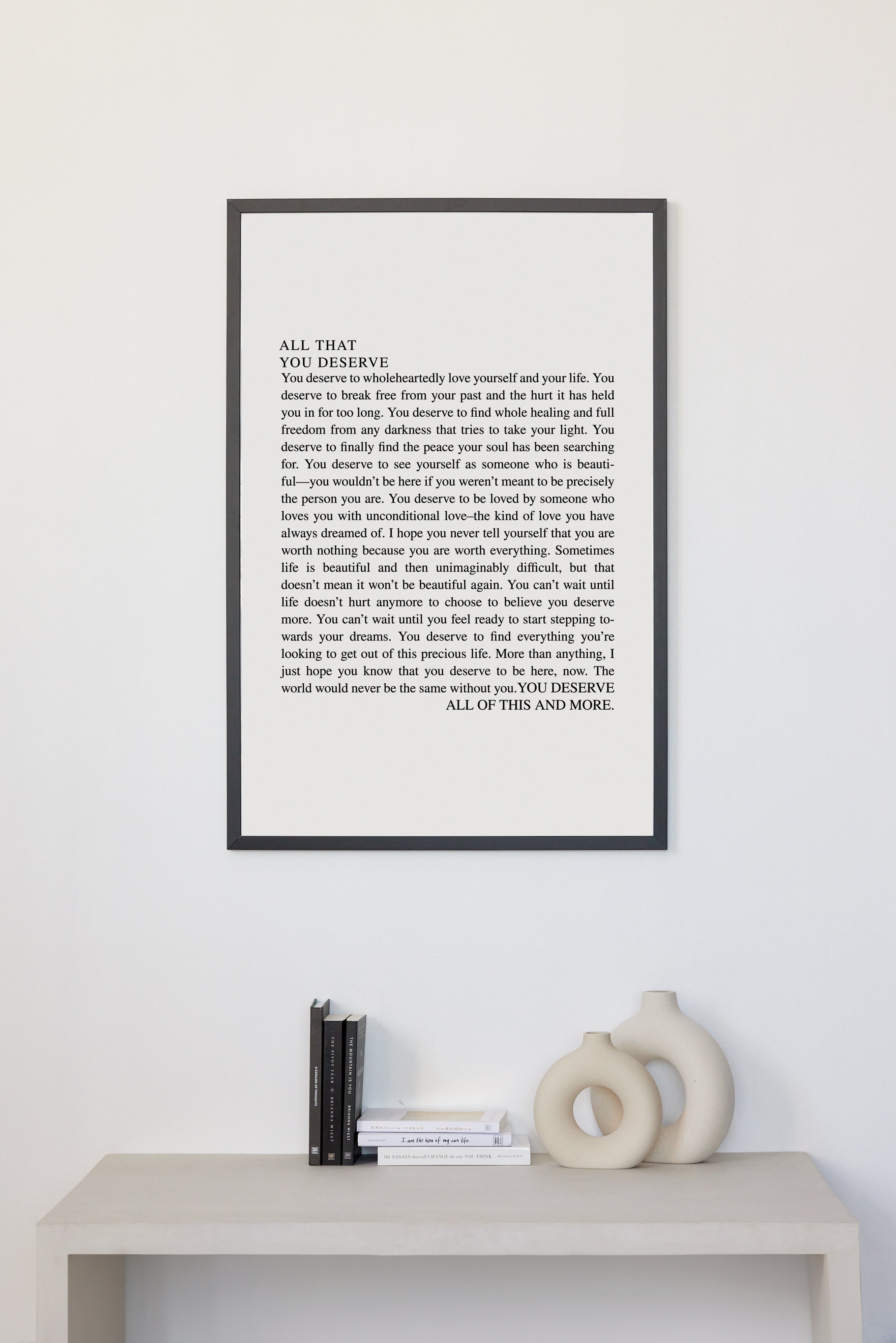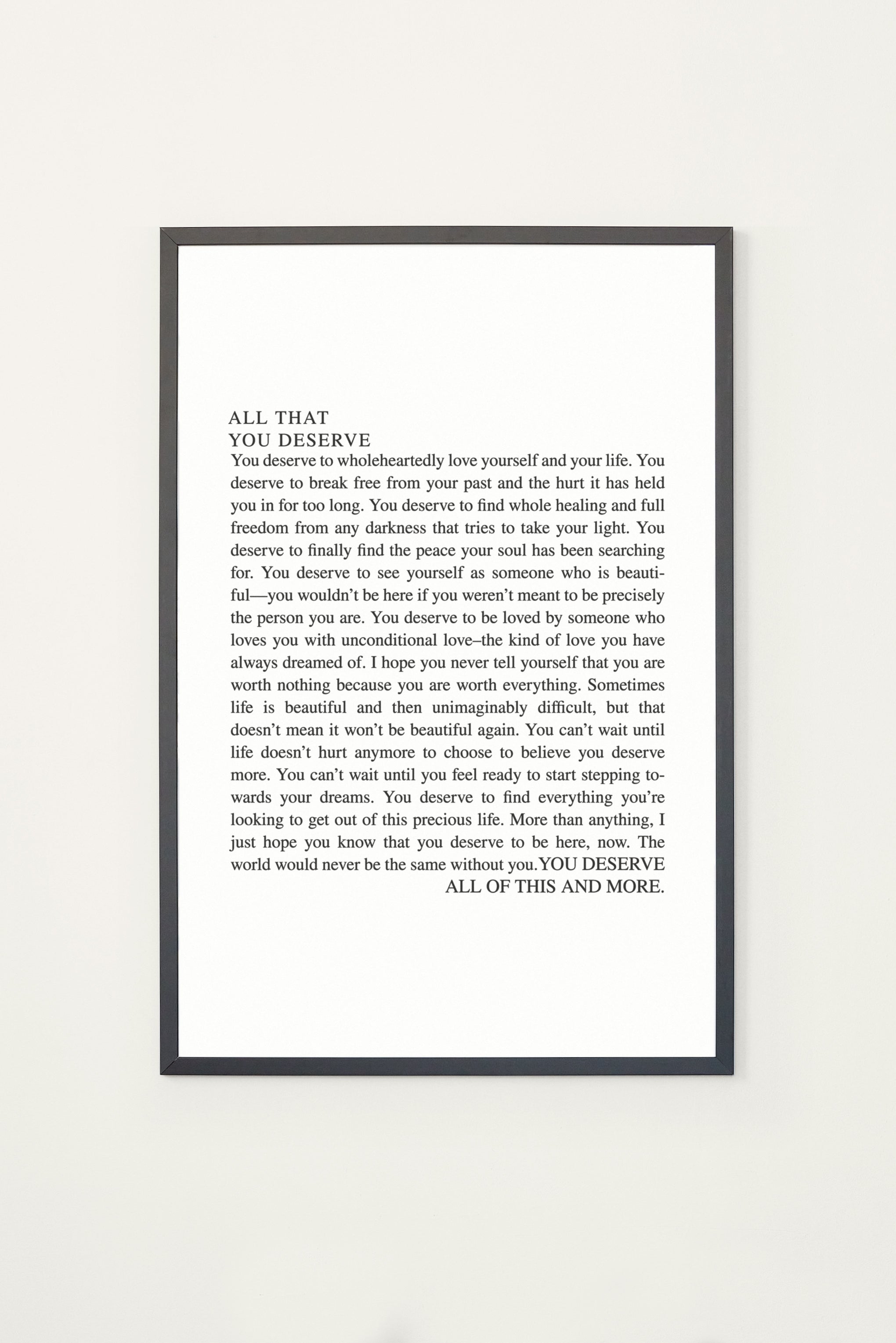 You deserve to wholeheartedly love yourself and your life. You deserve to break free from your past and the hurt it has held you in for too long. You deserve to find whole healing and full freedom from any darkness that tries to take your light. You deserve to finally find the peace your soul has been searching for. You deserve to see yourself as someone who is beauti-ful—you wouldn't be here if you weren't meant to be precisely the person you are. You deserve to be loved by someone who loves you with unconditional love-the kind of love you have always dreamed of. I hope you never tell yourself that you are worth nothing because you are worth everything. Sometimes life is beautiful and then unimaginably difficult, but that doesn't mean it won't be beautiful again. You can't wait until life doesn't hurt anymore to choose to believe you deserve more. You can't wait until you feel ready to start stepping towards your dreams. You deserve to find everything you're looking to get out of this precious life. More than anything, I just hope you know that you deserve to be here, now. The world would never be the same without you. YOU DESERVE ALL OF THIS AND MORE.