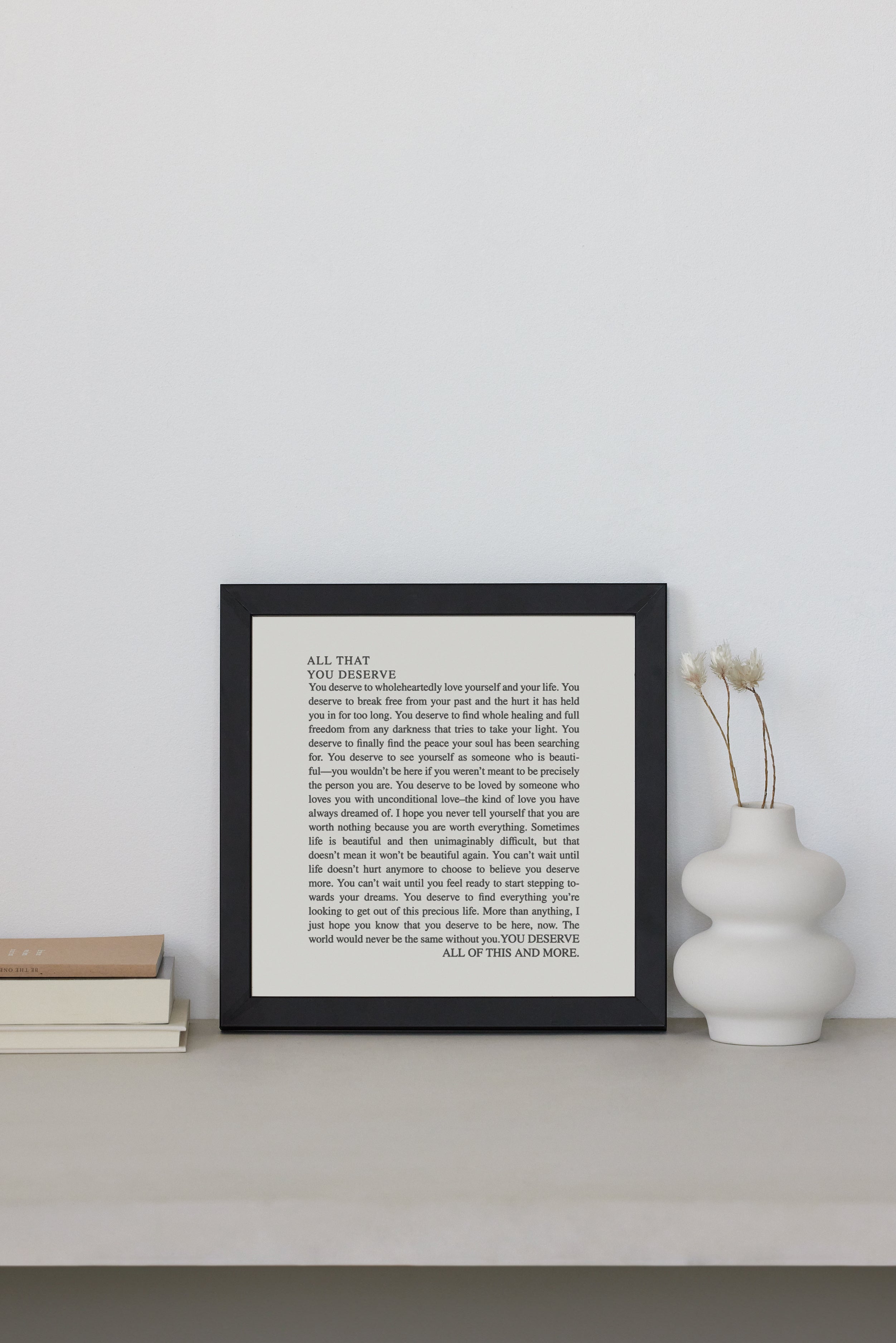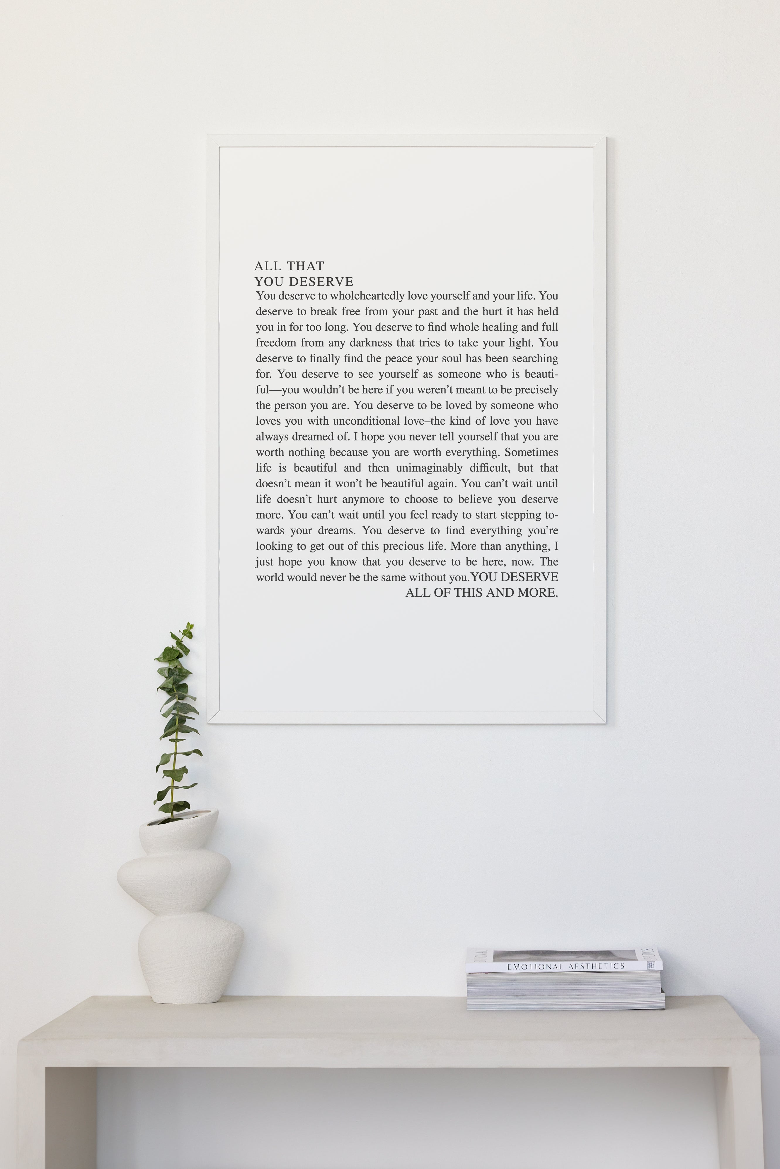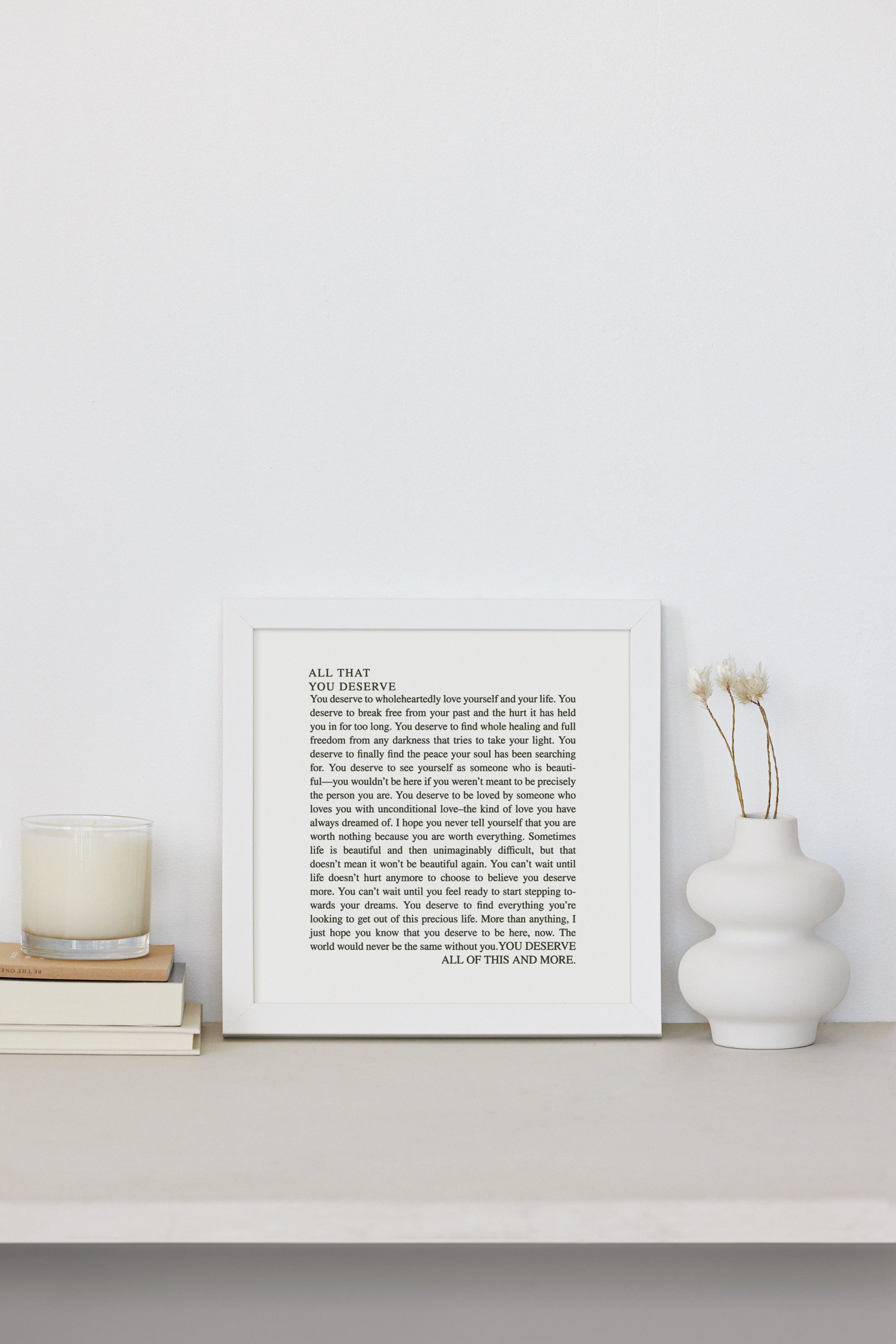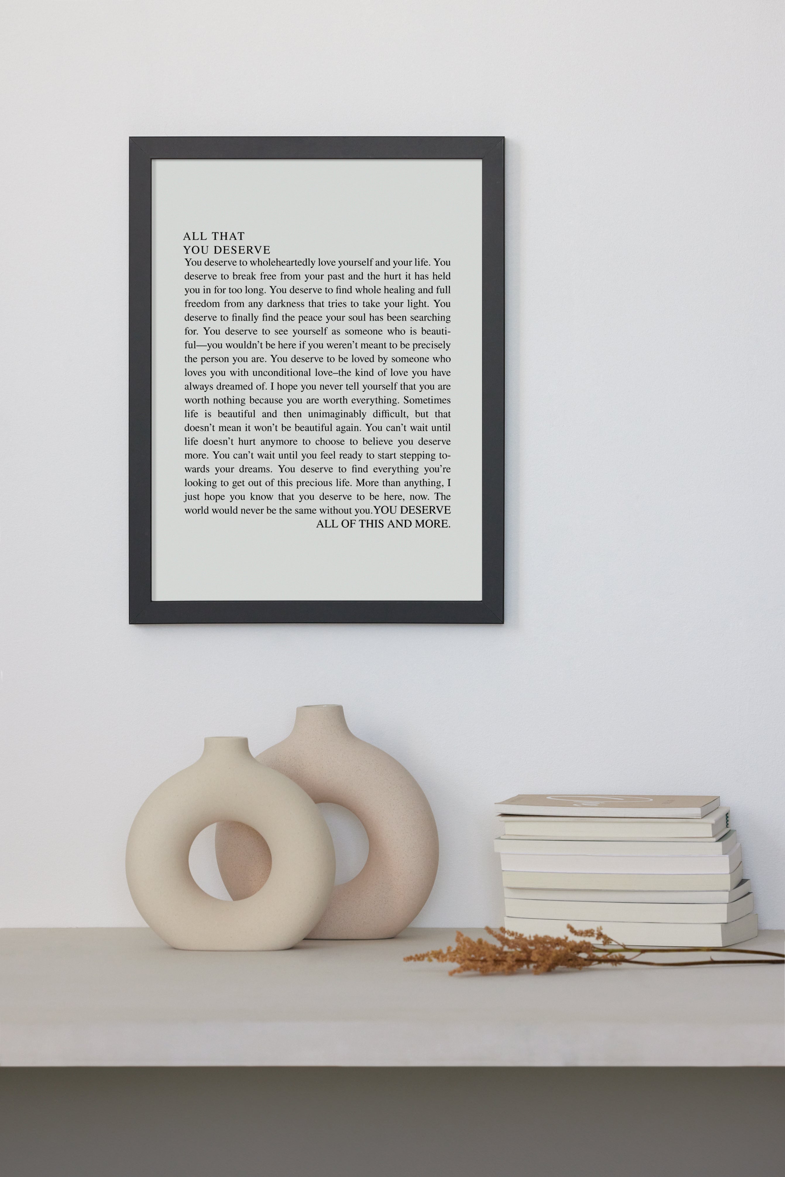 You deserve to wholeheartedly love yourself and your life. You deserve to break free from your past and the hurt it has held you in for too long. You deserve to find whole healing and full freedom from any darkness that tries to take your light. You deserve to finally find the peace your soul has been searching for. You deserve to see yourself as someone who is beauti-ful—you wouldn't be here if you weren't meant to be precisely the person you are. You deserve to be loved by someone who loves you with unconditional love-the kind of love you have always dreamed of. I hope you never tell yourself that you are worth nothing because you are worth everything. Sometimes life is beautiful and then unimaginably difficult, but that doesn't mean it won't be beautiful again. You can't wait until life doesn't hurt anymore to choose to believe you deserve more. You can't wait until you feel ready to start stepping towards your dreams. You deserve to find everything you're looking to get out of this precious life. More than anything, I just hope you know that you deserve to be here, now. The world would never be the same without you. YOU DESERVE ALL OF THIS AND MORE.