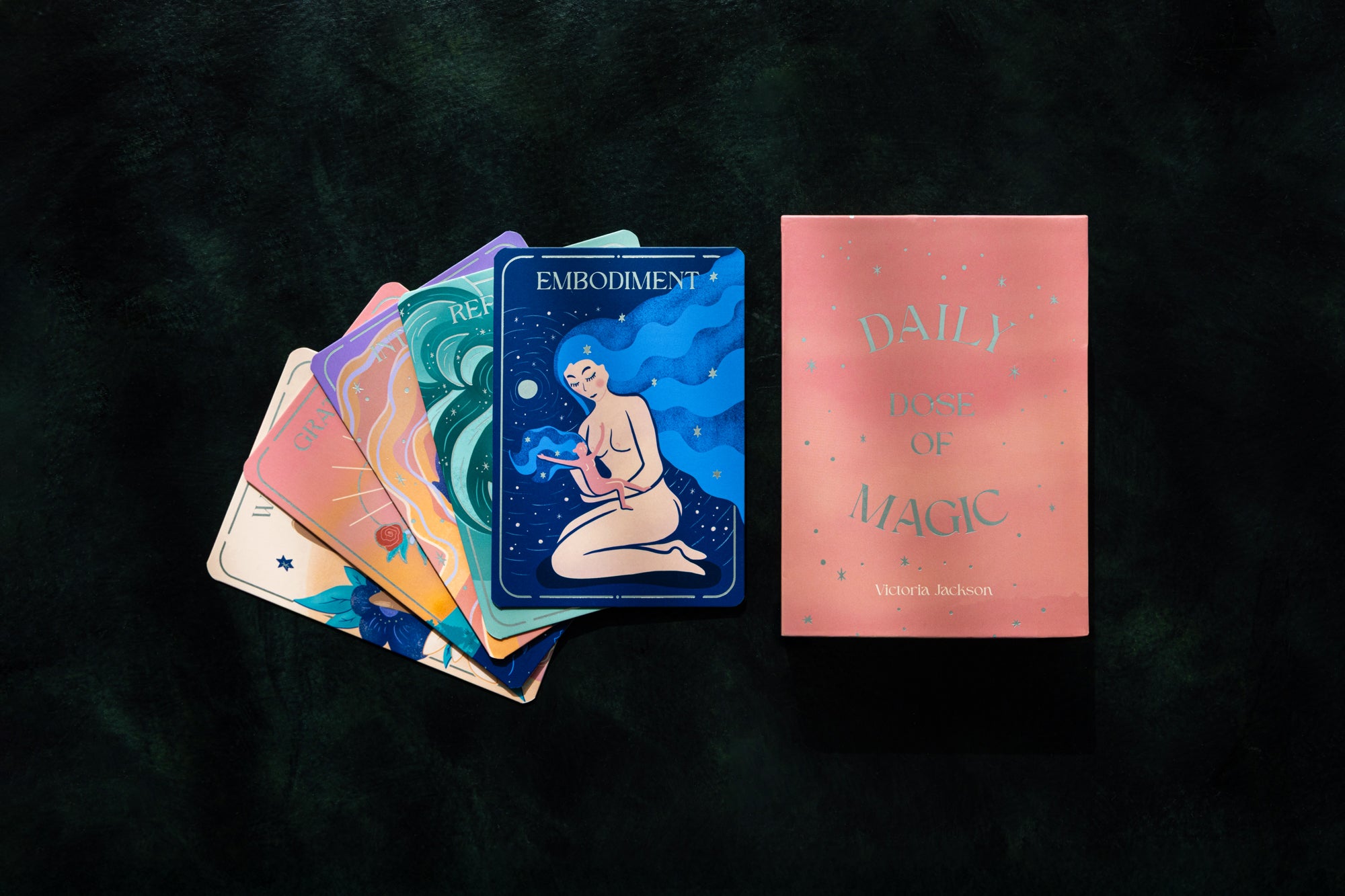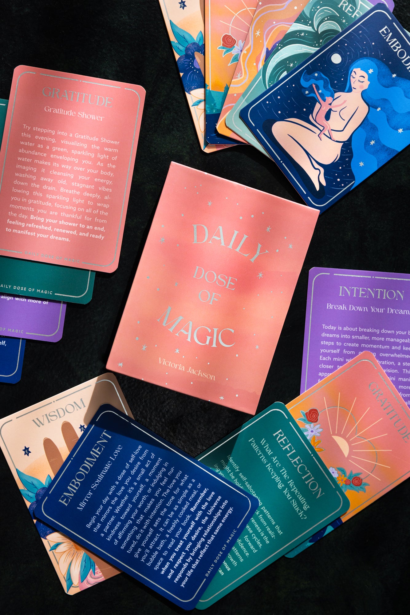 The Daily Dose of Magic Manifestation Card Deck by Victoria Jackson is designed to offer inspiration across five key areas: Intention, Embodiment, Gratitude, Reflection, and Wisdom, guiding you as you manifest your dream life into reality.
