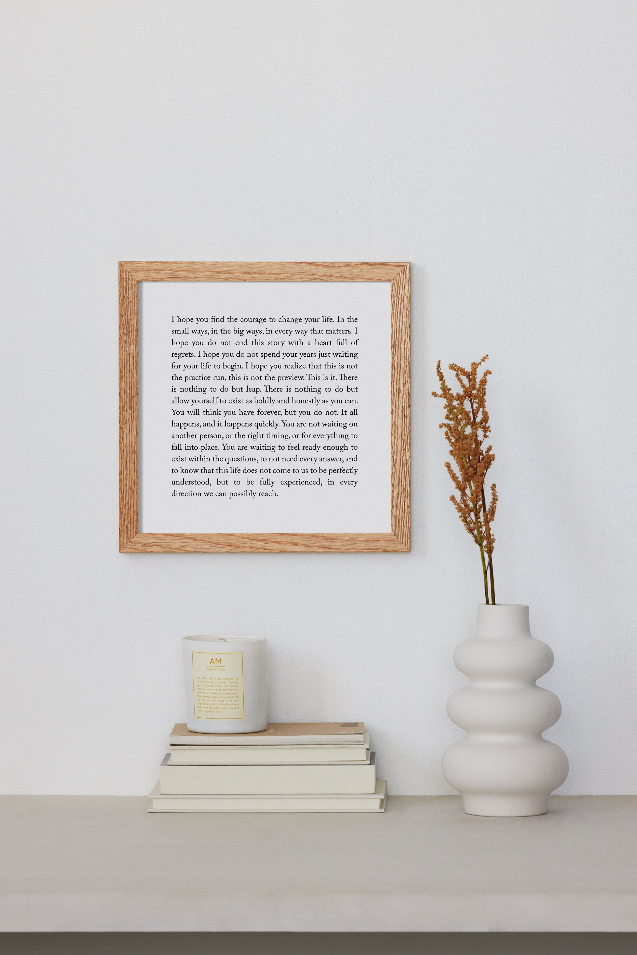I hope you find the courage to change your life. In the small wavs. in the big wavs. in every way that matters. hope you do not end this story with a heart full of regrets. I hope you do not spend your years just waiting for vour life to begin. I hope you realize that this is no the practice run, this is not the preview. This is it. Ther is nothing to do but leap. There is nothing to do bu allow vourself to exist as boldly and honestly as you can You will think you have forever, but you do not. It al happens, and it happens quickly. You are not waiting or another person, or the right timing, or for everything t fall into place. You are waiting to feel ready enough to