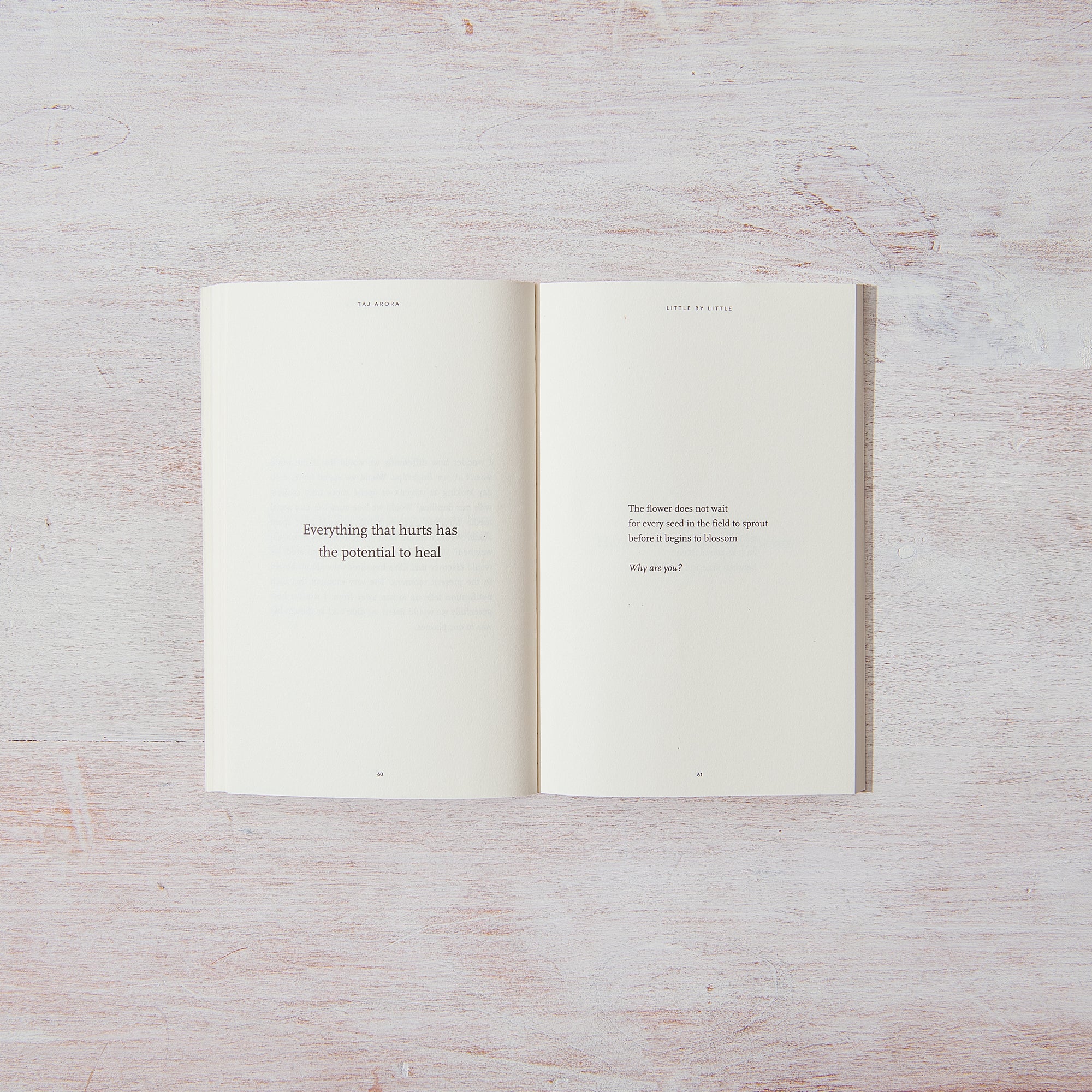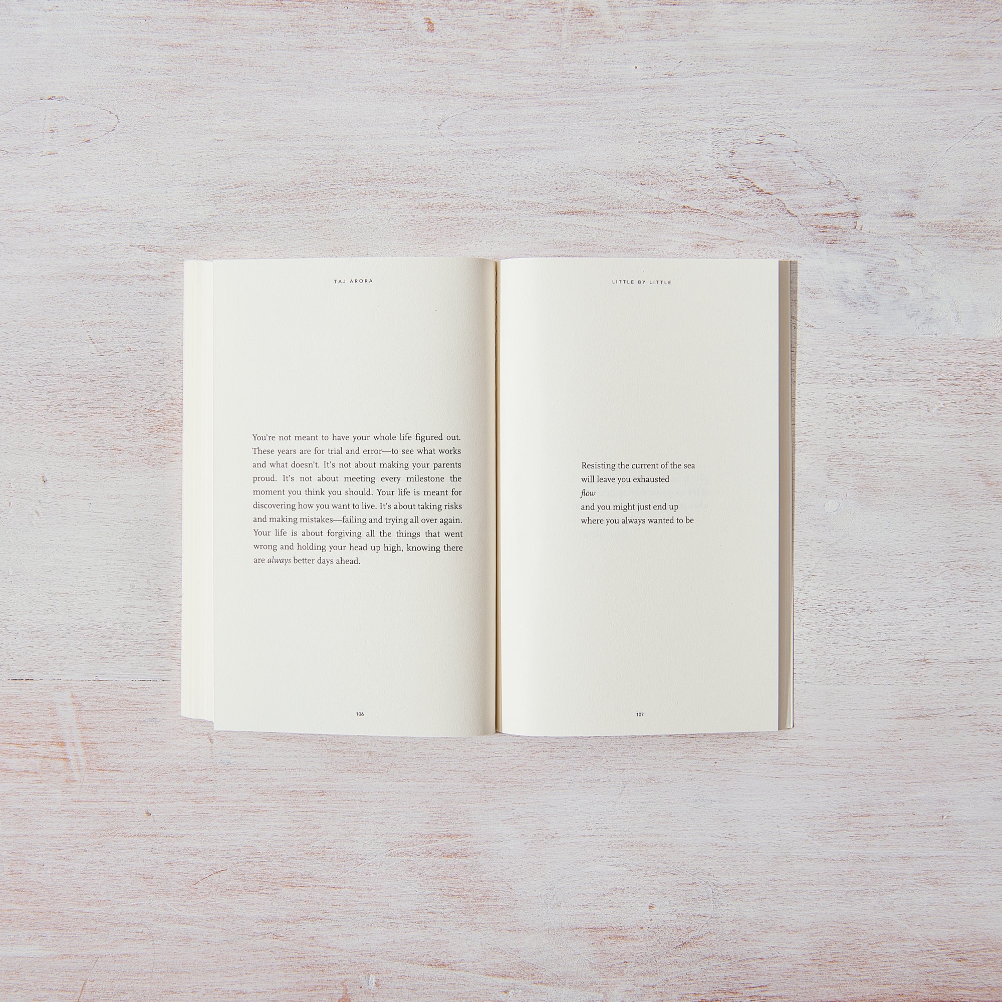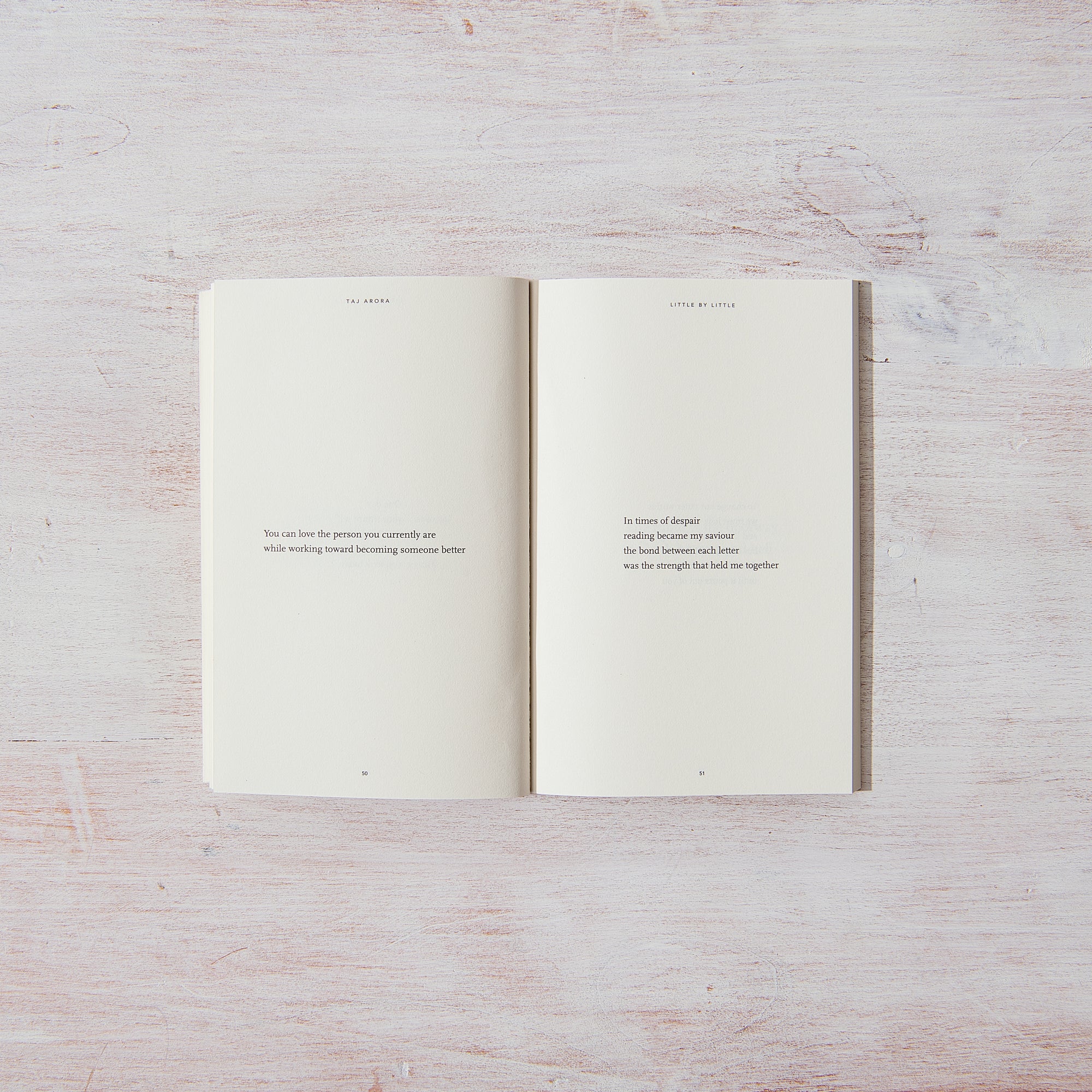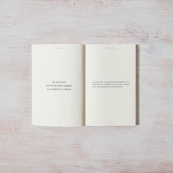 “I hope the words on these pages give you the courage you need to keep your heart open—to feel the heights of light and feel the depths of darkness. Little by Little is a compilation of lessons on self-love, acceptance, and healing.”