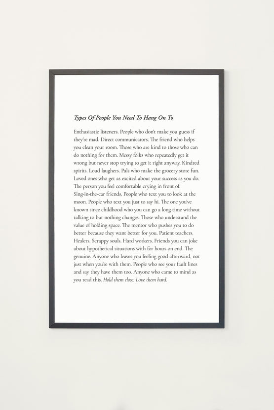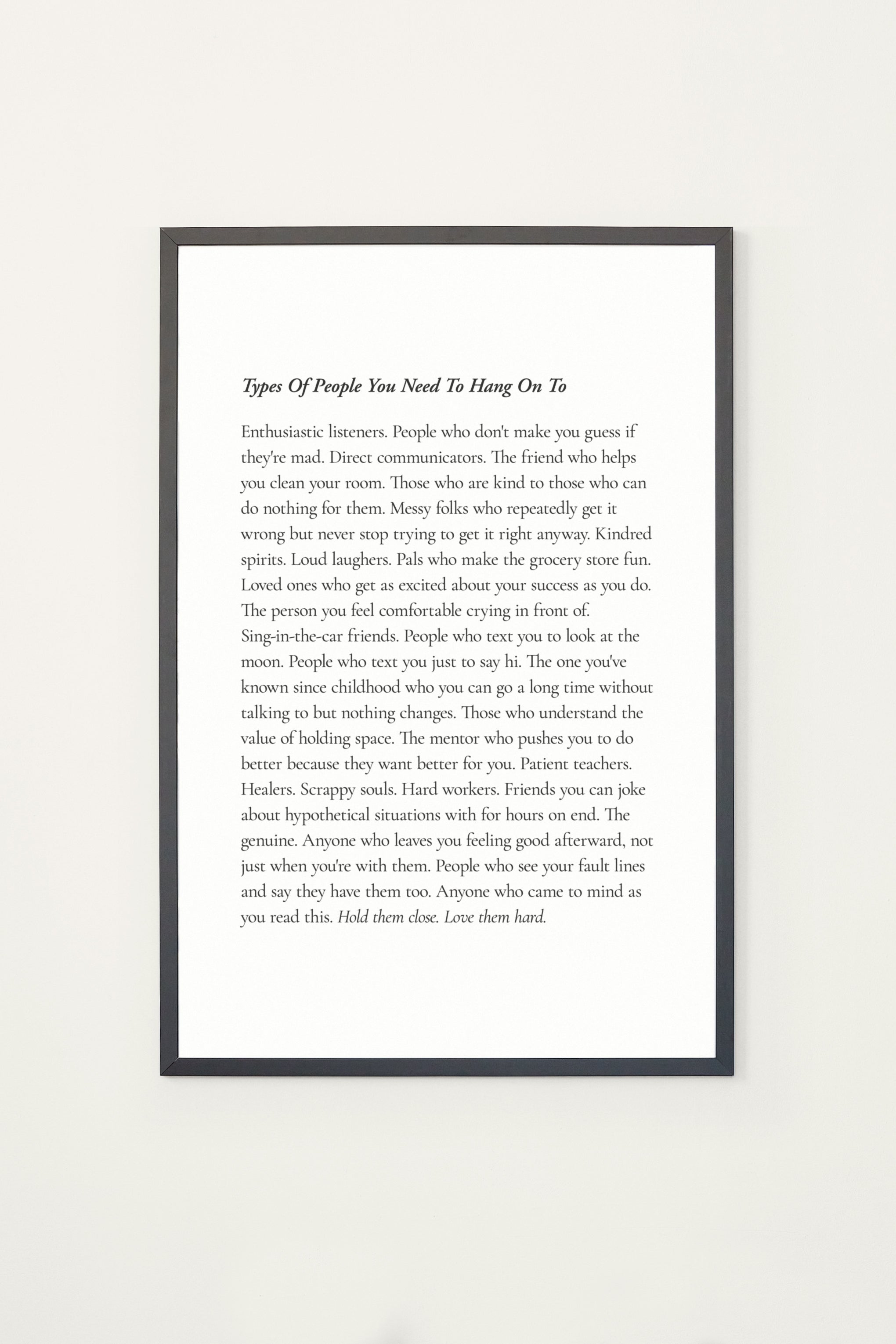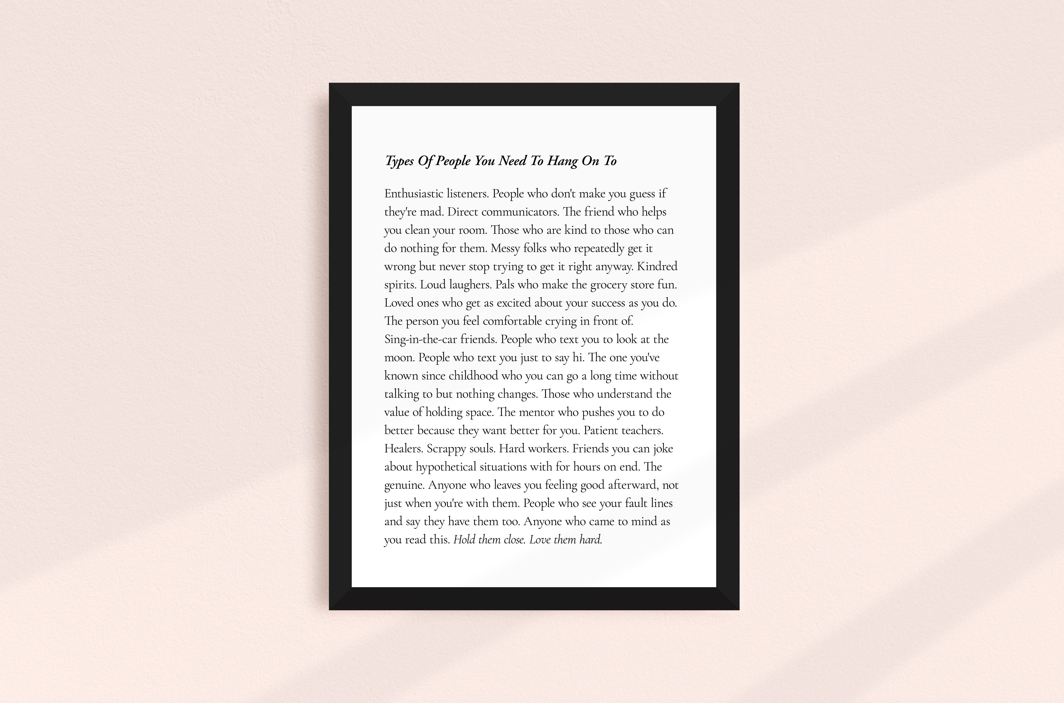 Enthusiastic listeners. People who don't make you guess if they're mad. Direct communicators. The friend who helps you clean your room. Those who are kind to those who can do nothing for them. Messy folks who repeatedly get it wrong but never stop trying to get it right anyway. Kindred spirits. Loud laughers. Pals who make the grocery store fun. Loved ones who get as excited about your success as you do. The person you feel comfortable crying in front of. Sing-in-the-car friends. People who text you to look at the moon. People who text you just to say hi. The one you've known since childhood who you can go a long time without talking to but nothing changes. Those who understand the value of holding space. The mentor who pushes you to do better because they want better for you. Patient teachers. Healers. Scrappy souls. Hard workers. Friends you can joke about hypothetical situations with for hours on end. The genuine. Anyone who leaves you feeling good afterward, not just when you're with them. People who see your fault lines and say they have them too. Anyone who came to mind as you read this. Hold them close. Love them hard.